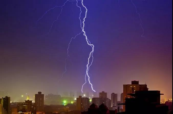 在這張照片里,攝影師很巧妙的捕捉到了閃電,天空的藍(lán)色和城市燈光所暈染出的紫色給照片蒙上了一種怪異的感覺。