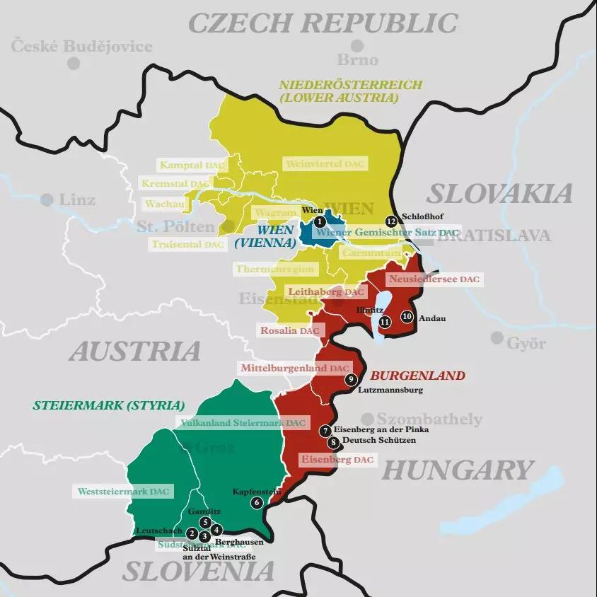 奧地利葡萄酒產(chǎn)區(qū)劃分為4個(gè)大區(qū),共17個(gè)子產(chǎn)區(qū)。(西部零散葡萄園本文不做介紹)