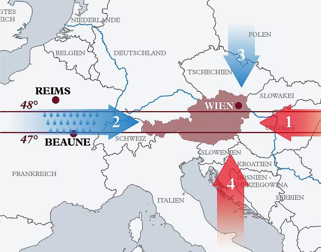 奧地利位于歐洲腹地,西部與南部被阿爾卑斯山脈覆蓋,葡萄酒產(chǎn)區(qū)集中在東部地區(qū)。
