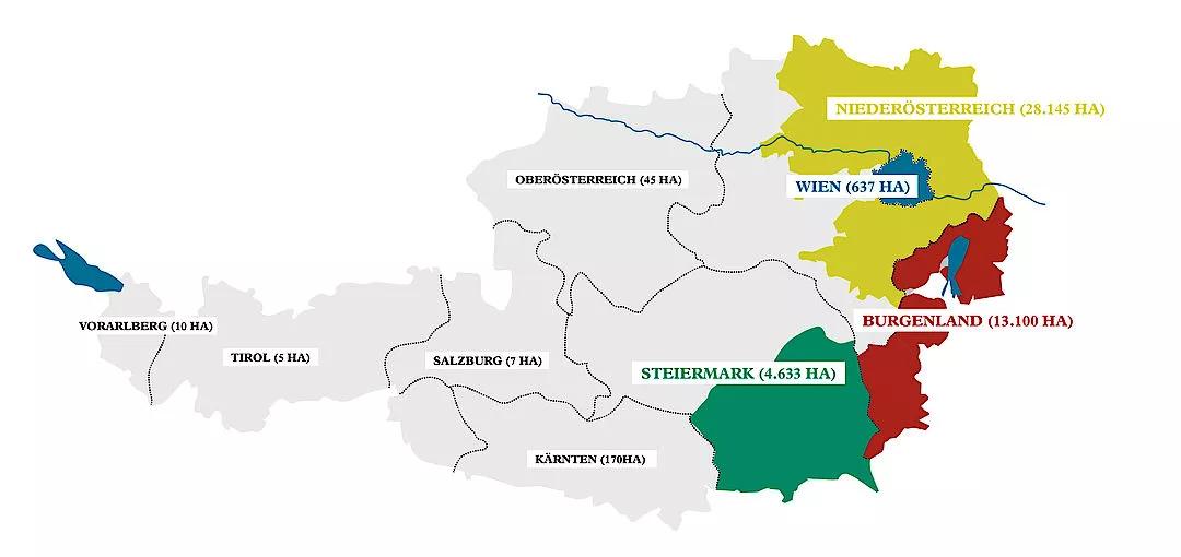 目前全奧地利4個(gè)大區(qū)下的17個(gè)子產(chǎn)區(qū)均獲準(zhǔn)釀造PDO葡萄酒。