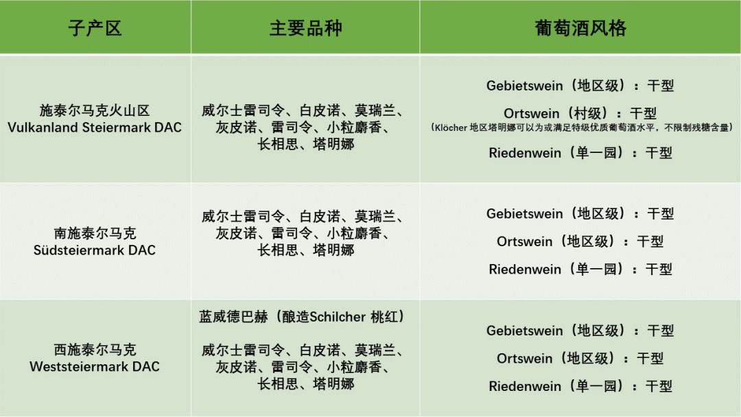 雖然擁有3個(gè)子產(chǎn)區(qū)(全部為DAC),然而施泰爾馬克的產(chǎn)量僅占了全國產(chǎn)量的7%,并且絕大多數(shù)都是白葡萄酒(西施泰爾馬克出產(chǎn)一種極具特色的Schilcher桃紅)。