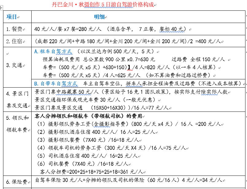 (8)其他費(fèi)用。如果是主題自駕游,涉及到租場(chǎng)地、聘請(qǐng)指導(dǎo)教師費(fèi)用及其他費(fèi)用由游客分?jǐn)?。需要分?jǐn)偟矫總€(gè)游客頭上。