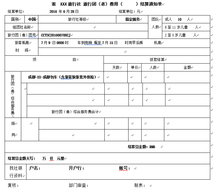 單項(xiàng)委托合同簽訂好之后,組團(tuán)社就應(yīng)該給團(tuán)隊(duì)或個(gè)人發(fā)一個(gè)費(fèi)用結(jié)算通知單,敦促對(duì)方把錢(qián)劃在賬戶上。