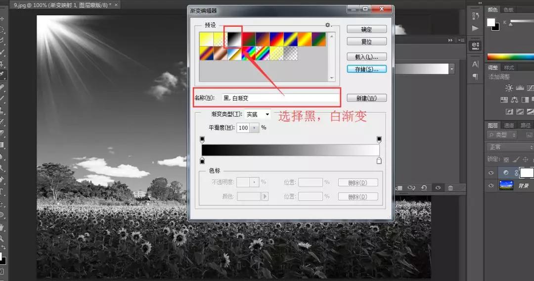 圖片導(dǎo)入進來之后,點擊右下角半黑半白的圓形圖標——選擇漸變映射——雙擊漸變條——選擇“黑,白漸變”確定即可。
