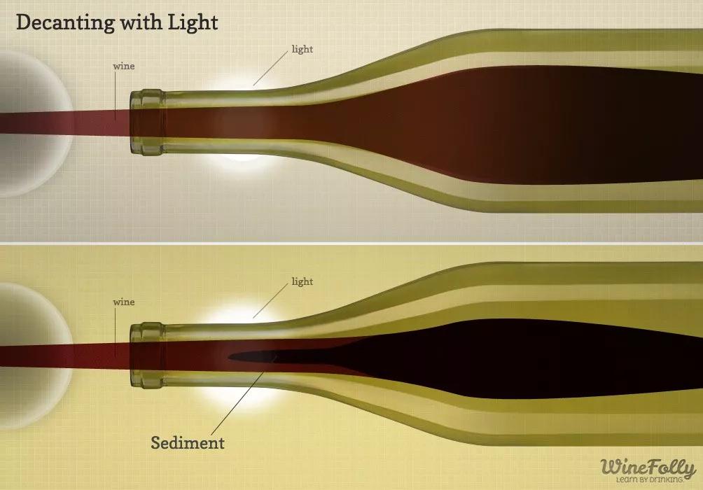 傳統(tǒng)做法都是在強光源下倒酒,看到最后沉在瓶底的酒渣后,立馬停下