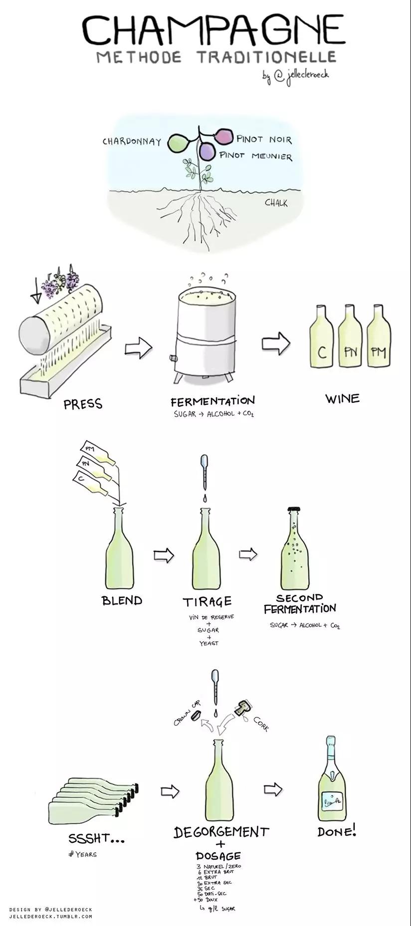 不同于靜止葡萄酒的一步到位,不管是使用傳統(tǒng)法轉(zhuǎn)移法或是罐中發(fā)酵法,起泡酒(包括香檳、Cava、Prosecco等一系列非人工加氣起泡酒)的釀造都需要經(jīng)歷一個(gè)二次發(fā)酵的過程。