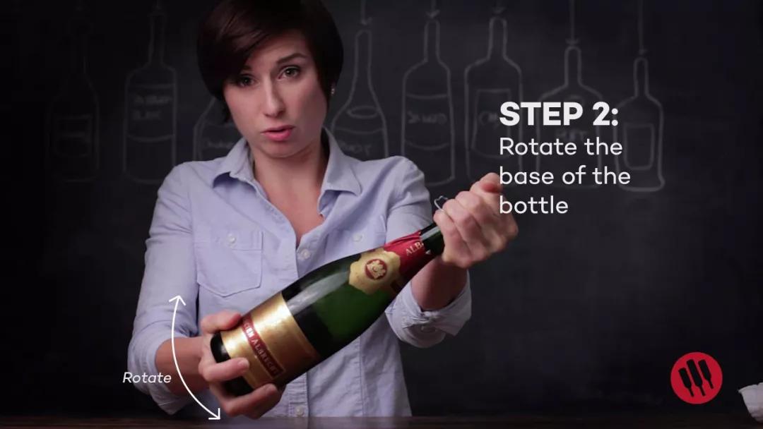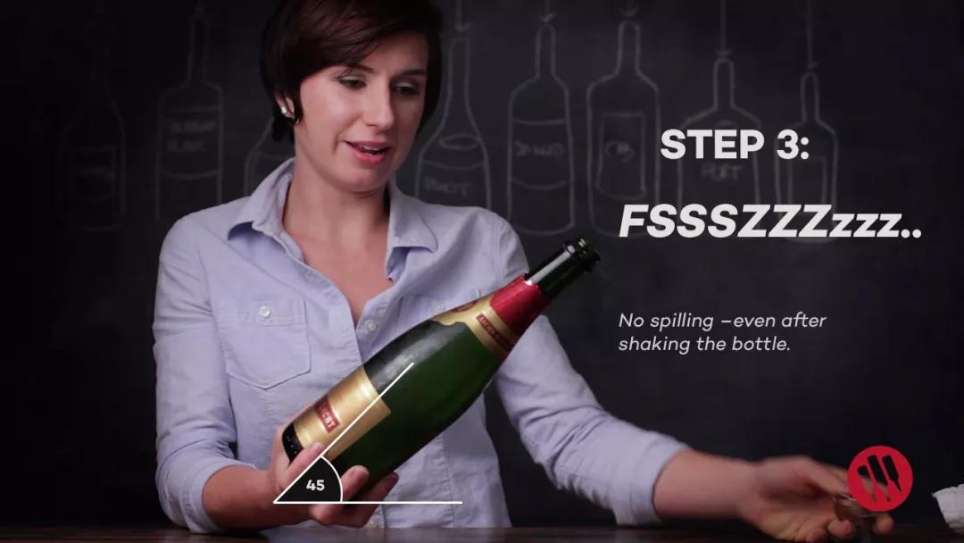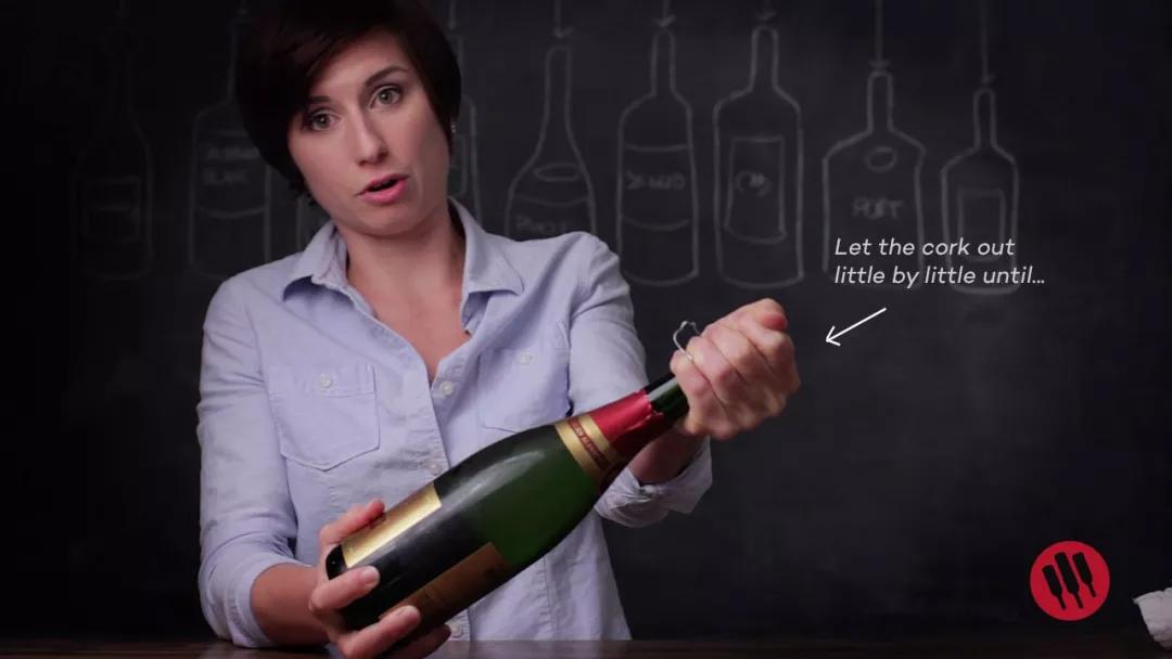 第三步,繼續(xù)保持瓶身傾斜,緩慢轉(zhuǎn)動(dòng)瓶身(不要轉(zhuǎn)瓶塞哦~),此時(shí)可以感覺到木塞正被瓶內(nèi)的氣壓緩慢推動(dòng)。當(dāng)感覺到木塞松動(dòng)即將沖出瓶口時(shí),停止旋轉(zhuǎn),握住木塞的手指略微傾斜,緩緩將瓶內(nèi)壓力放出,此時(shí)你會(huì)聽到“嘶”的一聲,同時(shí)木塞也已經(jīng)安全打開。