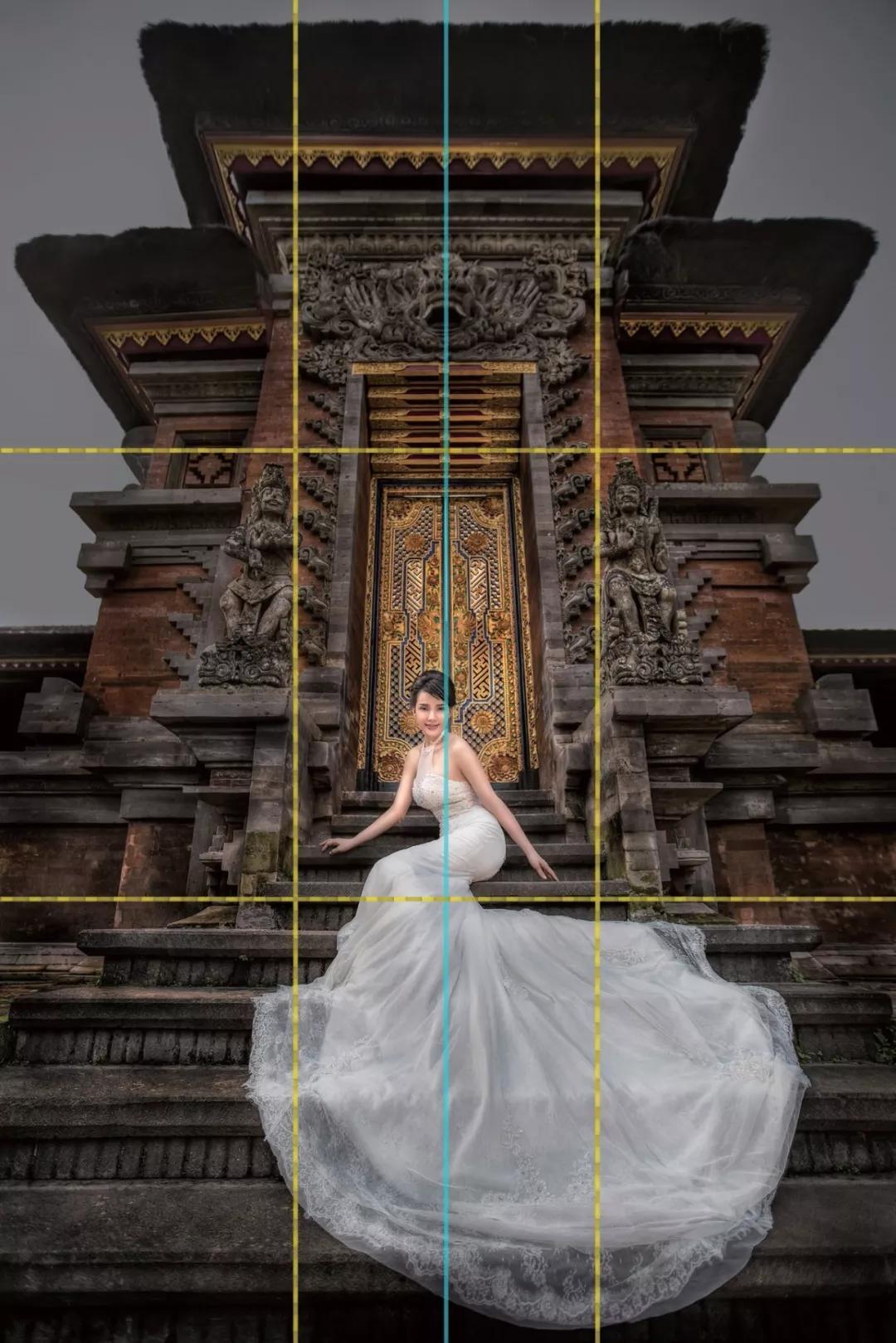 但其實(shí)這也是借用了建筑物的線條引導(dǎo),將觀者注意力從前景延伸到背景,又或者從背景過渡到畫面主體(藍(lán)色線為對稱參考線)。