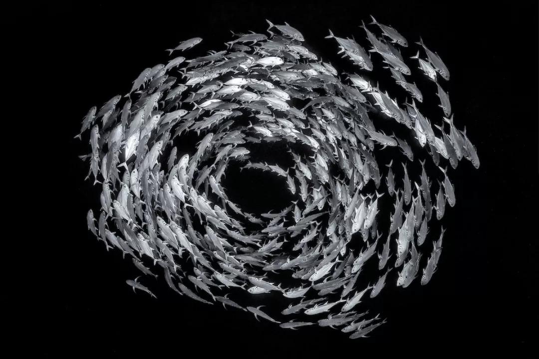一大群六帶鲹在水里組成了環(huán)狀,它們這一行為是交配前的約會練習(xí),同時還可以威嚇一下潛在捕食者。像這樣的聚會產(chǎn)卵很容易被捕漁者一鍋端,但幸運(yùn)的是,這群魚生活在紅海禁止捕漁的海洋保護(hù)區(qū)域內(nèi)。