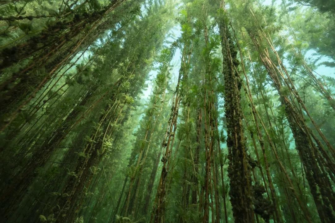 在他貼著水面游動的時候,他突然發(fā)現(xiàn)一個巨大的長矛消失在下面的雜草中。他向下游去,游近了才發(fā)現(xiàn)自己仿佛置身于一個水下叢林中, Michel 用廣角構(gòu)圖的方式營造出一種置身于參天大樹的森林中,從地面向上凝視的感覺。