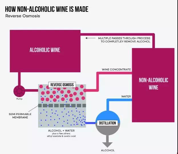 反滲透法(這與海水淡化的原理是一樣的),也叫超過(guò)濾法,其利用只允許溶劑透過(guò)、不允許溶質(zhì)透過(guò)的半透膜,先葡萄酒中的芳香化合物和酚類(lèi)物質(zhì)與酒精和水分開(kāi),再通過(guò)蒸餾來(lái)將酒精和水分離。由于半透膜的成本高,所以這種方法比較昂貴。