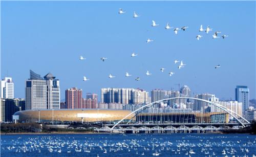 后參觀【天鵝湖國際城市濕地公園】,位于三門峽市東西城區(qū)之間的生態(tài)區(qū)內(nèi),現(xiàn)有面積8850畝,其中陸地6150畝,水面、灘涂2700畝,核心景區(qū)包括雙龍湖白天鵝觀賞區(qū)、陜州古城和沿黃生態(tài)林帶三部分,是一處融生態(tài)、文化和人文地理于一體的自然山水;