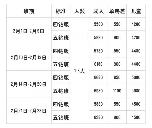 標(biāo)準(zhǔn)價格: 成人  6980 /人, 兒童  5080 /人