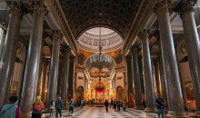 【圣伊薩基耶夫大教堂】:坐落在圣彼得堡市區(qū),外形雄偉壯觀,規(guī)模令人驚嘆。為了建造這座豪華的 教堂,皇室不惜人力、財力、物力,工程中運用了許多新技術和大膽的施工方法,其中用汞合金火燒法為 圓頂鍍金,使巨大的圓頂在經(jīng)歷一個半世紀之后,即便從未整修依然流光溢彩。教堂的建筑地基深達 10  米,外部共有 112 根整塊的深玫瑰色和斑環(huán)花崗巖圓柱,內(nèi)部則采用大量珍稀的彩色石料而顯得莊重華麗。她與梵蒂岡的圣彼得大教堂、倫敦的圣保羅大教堂、佛羅倫薩的花之圣母大教堂并稱為“世界四大圓 頂教堂”;