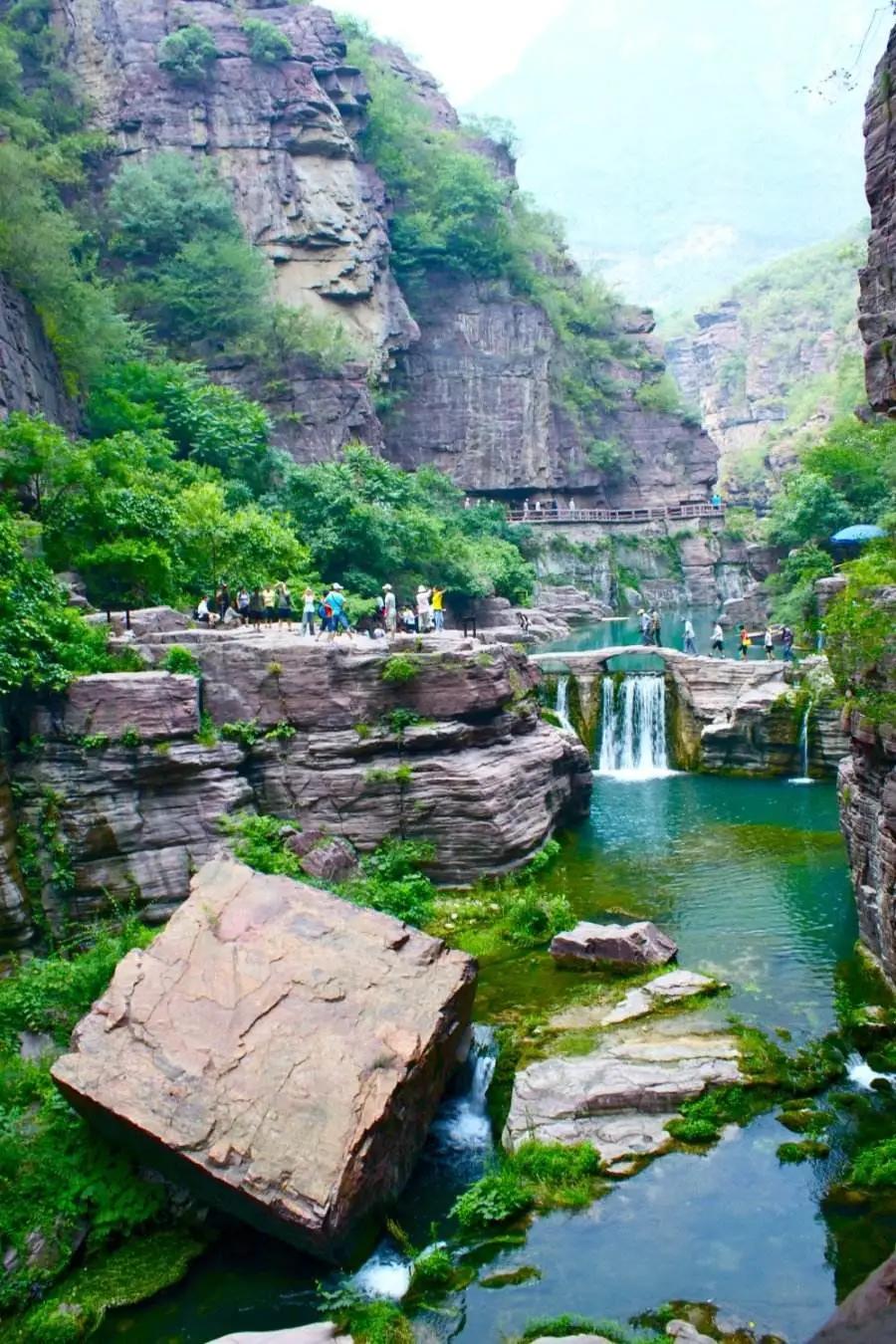 后前往云臺山,自行游覽盆景峽谷——【溫盤峪】(又名紅石峽)。那里集華夏山水與方寸之中;欣賞白龍瀑、黑龍洞、懸石、相吻石、含羞石、天女散化瀑等景觀,觀北方罕見景觀鐘乳石,盡情領(lǐng)略“真山、真水、真空氣”,游覽子房湖, 后游覽云臺山最高峰【茱萸峰】,茱萸峰是歷代文人墨客,僧道修行的圣地,這里植被茂密,古樹參天,有千年名樹紅豆杉,五角楓樹,太行花,森林覆蓋率高達(dá)93%,滿山覆蓋的都是原始次生林,有天然氧吧之美譽(yù)。踏千階的云梯棧道登上海拔1308米的茱萸峰頂,但見群山連綿,峰涌云動,使人頓生“會當(dāng)凌絕頂,一覽眾山小”的豪邁氣概。俯視腳下,群峰形似海浪涌。山頂氣候多變,倏忽間風(fēng)起云生,白霧從山間咕嘟嘟地涌出,紅日隨即隱去。山峰在云霧中出沒,云騰山浮,如臨仙界。玻璃棧道位于云臺山茱萸峰鳳凰嶺景點(diǎn),在海拔1080米的半山腰上依崖而建。【玻璃棧道】分為兩段,其中一段沿崖壁呈U型,另一段懸于千米懸崖之上,總長400余米,寬約1.6米。(玻璃棧道體驗(yàn)費(fèi),為20元/人需自理,如遇景區(qū)政策性關(guān)閉,則取消該景點(diǎn),不另行通知,不退任何費(fèi)用)