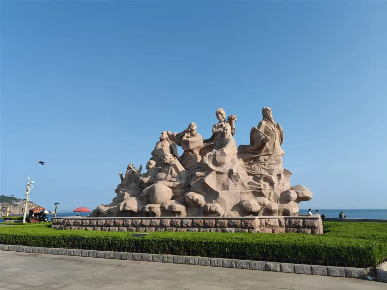 隨后前往【幸福門】被譽為“威海之門”,成為威海的標志,代表著威?,F(xiàn)代化的城市形象。地上有一個凸起的圓形鍛銅建筑,稱“萬福圖”,排列成五圈的“福字,寓意“五福臨門”、“五福同享”。從這里看海,天藍藍水藍藍,美不勝收,恨不能在此沉醉不醒??渗B瞰近在咫尺的劉公島全貌。