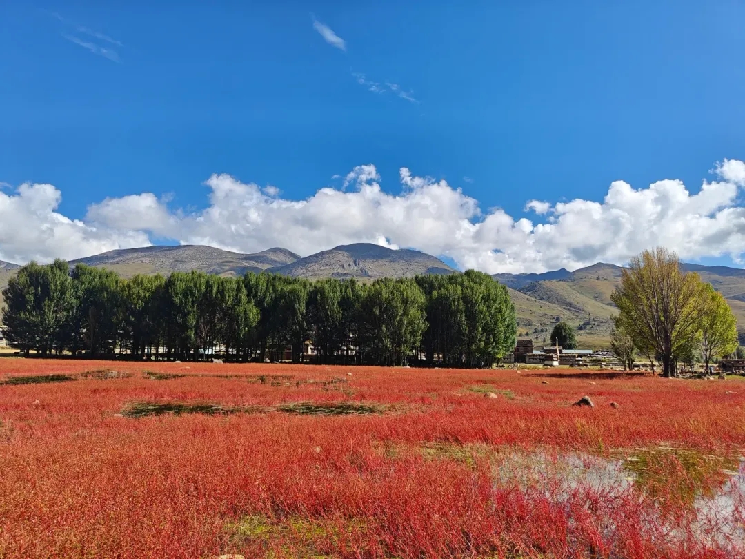 后乘車(chē)經(jīng)桑堆鎮(zhèn)【紅草地】(注:紅草地為季節(jié)性景觀,只有在每年的9月底到10月初才能看到此處的草原呈紅色),在秋天的時(shí)候,配合上后面泛黃的樺樹(shù),倒映在水塘中,是許多書(shū)上所介紹的美景。之后翻越古冰川遺跡海子山到達(dá)理塘。