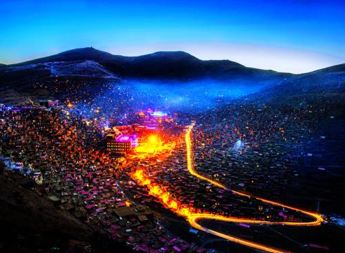 以佛學(xué)院的大經(jīng)堂為中心,密密麻麻搭滿了四面的山坡,