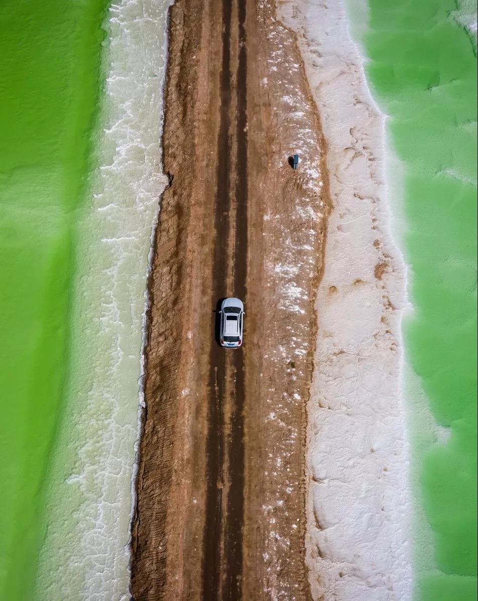 東臺(tái)吉乃爾湖的神奇之處在于一條泥路將湖水一分為二,一半是純正的蒂芙尼藍(lán),一半是含鹽量極高的純粹綠;乃爾湖岸邊盡是覆蓋著的白色結(jié)晶,湖周圍是大片的雅丹地貌,搭配上顏色干凈到極致的湖水、西北特有的廣闊無垠的天空,純粹而強(qiáng)烈的視覺沖擊,這方圓百里大漠戈壁無人區(qū)的珍寶明珠,這只屬于大自然的神秘顏色,讓你仿若來到了世界的盡頭,讓你感受一種歸于自然的內(nèi)心平靜。