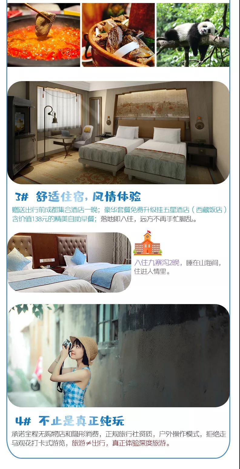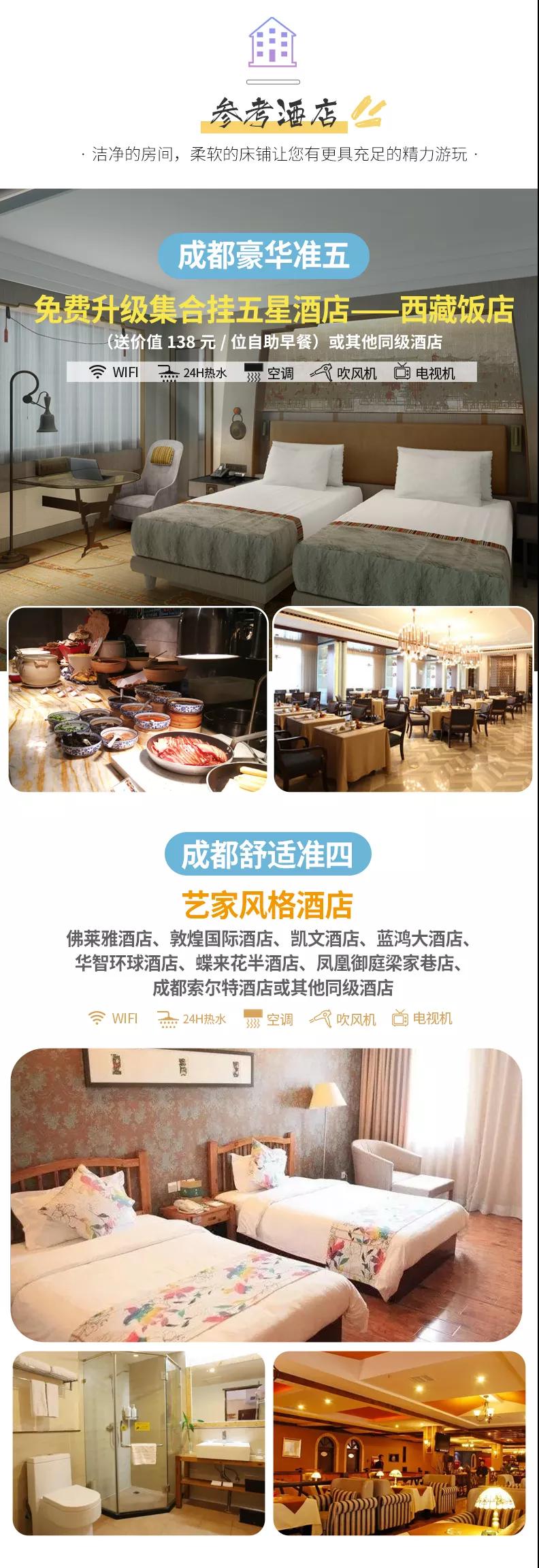 住宿:含4晚住宿;舒適標(biāo)準(zhǔn)全程準(zhǔn)四酒店;豪華標(biāo)準(zhǔn)全程準(zhǔn)五酒店,免費(fèi)升級2晚成都掛五星酒店。參考酒店如下: