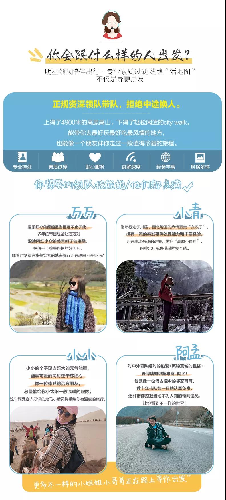3、九寨溝面積較大游客需求不一,因此主要以游客自助游形式游覽,如無導(dǎo)游陪同望您諒解。游覽開始前導(dǎo)游會與您約定好集合時間,請務(wù)必按時到達(dá)指定地點(diǎn),避免耽誤大家接下來的行程;