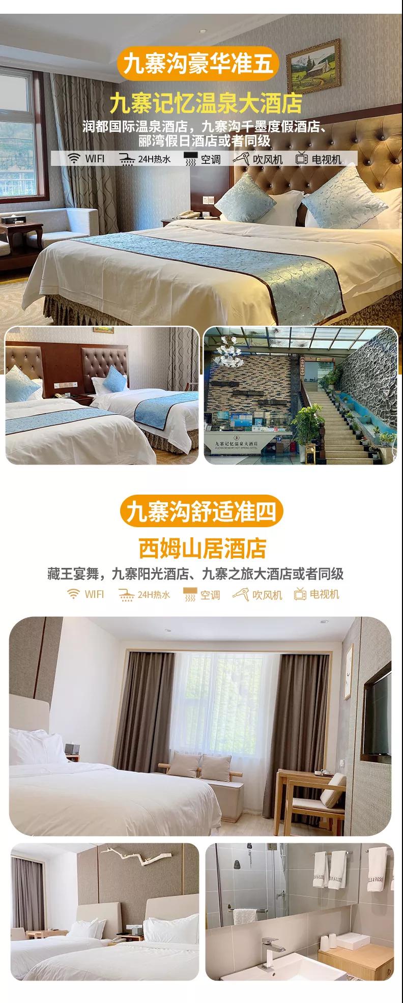 豪華準(zhǔn)五:九寨記憶溫泉大酒店,潤都國際溫泉酒店,九寨溝千墨度假酒店、酈灣假日酒店或者同級