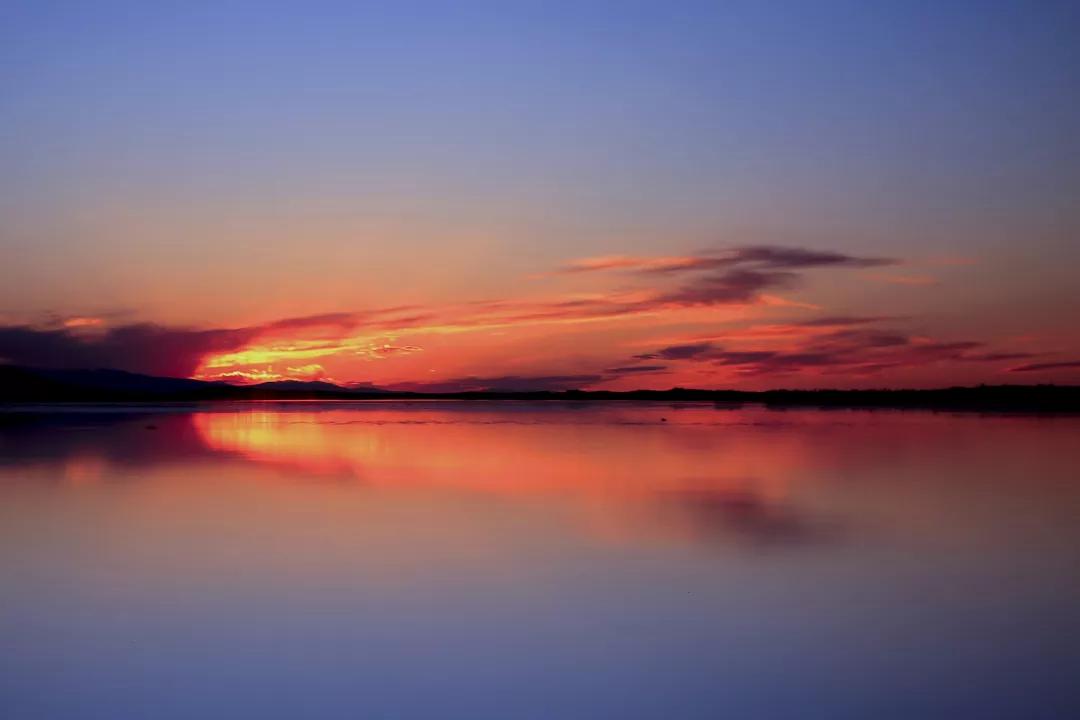 待日落時(shí)分,向西望,一團(tuán)赤球漸漸向湖面落去,將蔚藍(lán)的天燒出一方火紅晚霞,然后墜入溫柔冷清的青海湖,“落霞與孤鶩齊飛,秋水共長(zhǎng)天一色”便是對(duì)此情此景最好的寫照,這湖水寬闊得將天地融化,將日月融化,將一切融化,融化在那滟滟湖波中。
