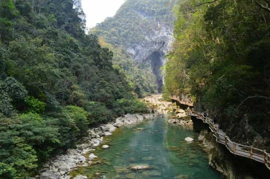 下午:后乘車前往游覽國家AAAAA級景區(qū)【大七孔】(游玩時間不少于2小時);大七孔是以原始森林、峽谷、伏流、地下湖為主體的景區(qū),沿著恐怖峽打狗河直下,可見吊橋,右邊的棧道一面靠山,一邊臨水,蜿蜒曲折,凹凸不平。最為震撼的還是走過棧道的三分之二處,有一橫跨河兩岸的天然巨巖,是喀斯特是貌奇觀之一,俗稱天生橋,被專家們譽為“大自然神力所塑的東方凱旋門”,仰觀橋孔下,只見巨型鐘乳懸掛,橋腳、橋側(cè)的裂隙石縫長出綠石草叢灌木,藤蘿花卉纏裹橋身,真是滿目琳瑯、五顏六色的天然大彩橋。