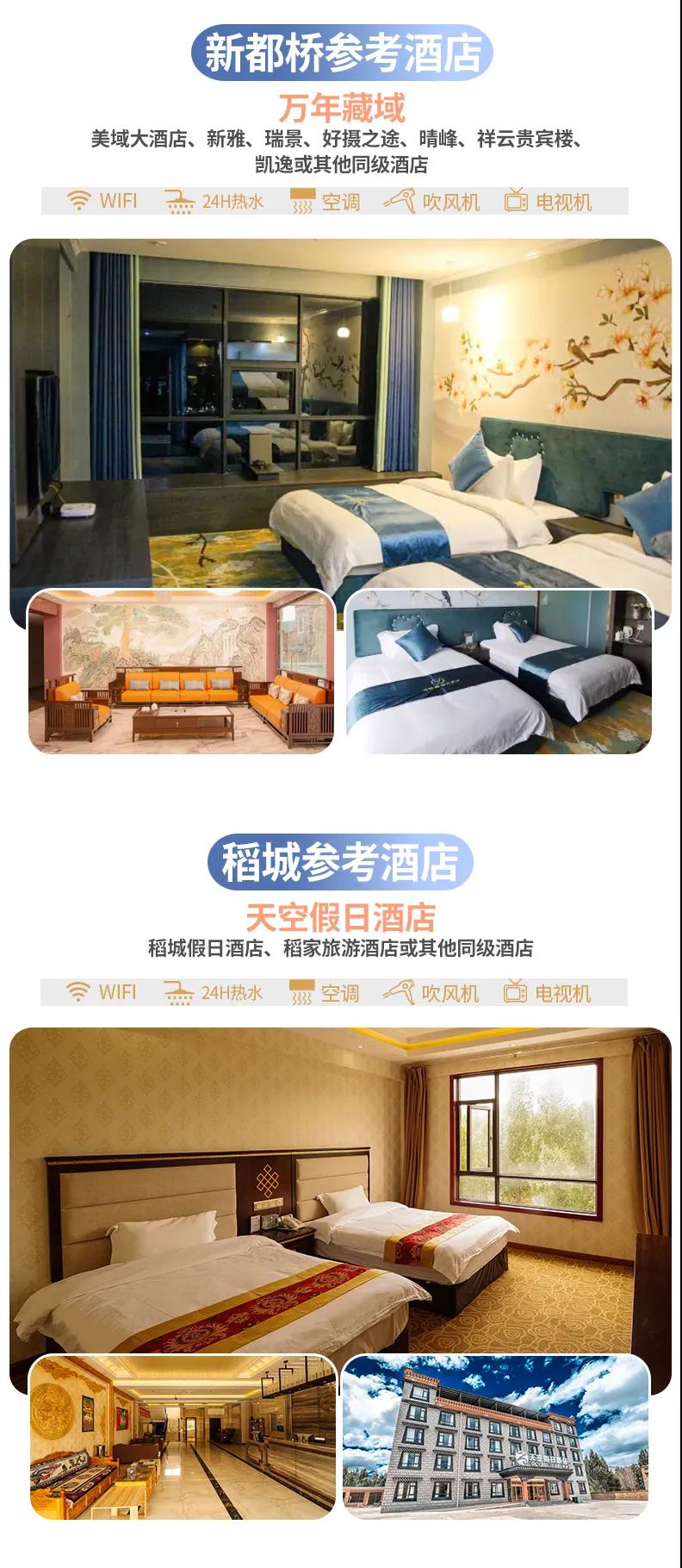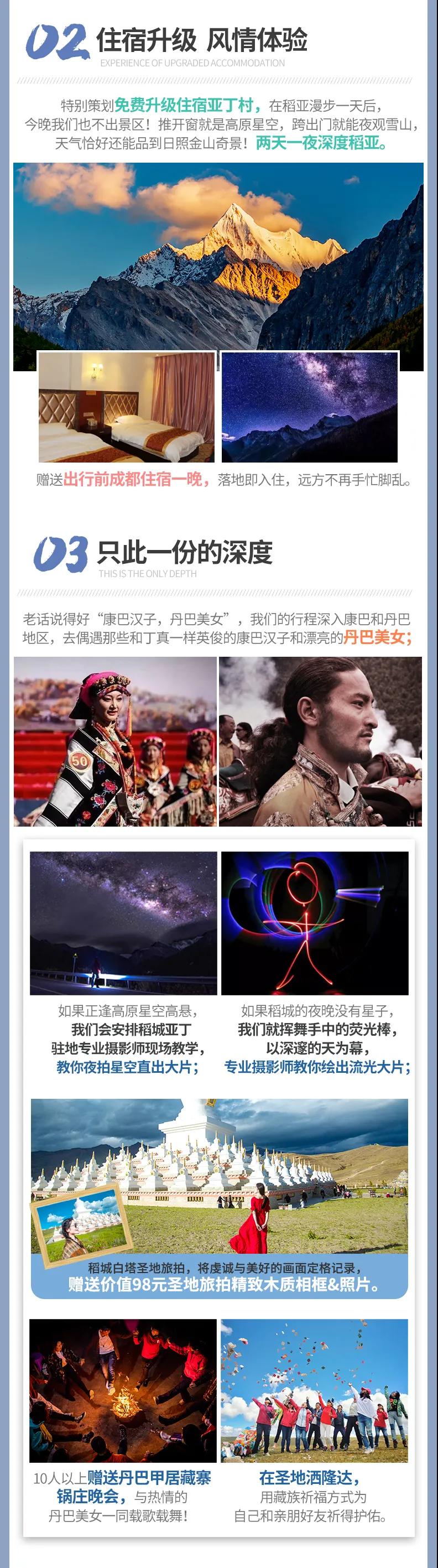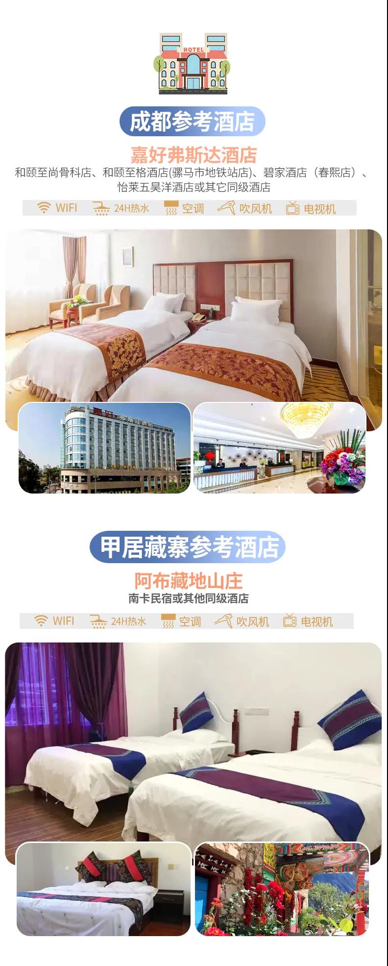 ? 贈(zèng)送:特色贈(zèng)送甲居藏寨藏家晚餐、高原特色牦牛湯鍋;贈(zèng)送旅游三寶、魔術(shù)頭巾、礦泉水緩解旅途疲勞;贈(zèng)送藏地撒隆達(dá);贈(zèng)送價(jià)值98元圣地旅拍精致木質(zhì)相框&照片;贈(zèng)送稻城專業(yè)攝影師現(xiàn)場(chǎng)教學(xué)夜拍星空直出大片,沒有星星時(shí)則教拍流光大片;10人以上贈(zèng)送甲居藏寨篝火晚會(huì);贈(zèng)送成都市區(qū)24小時(shí)接機(jī)/接火車服務(wù);贈(zèng)送項(xiàng)目不用不退。