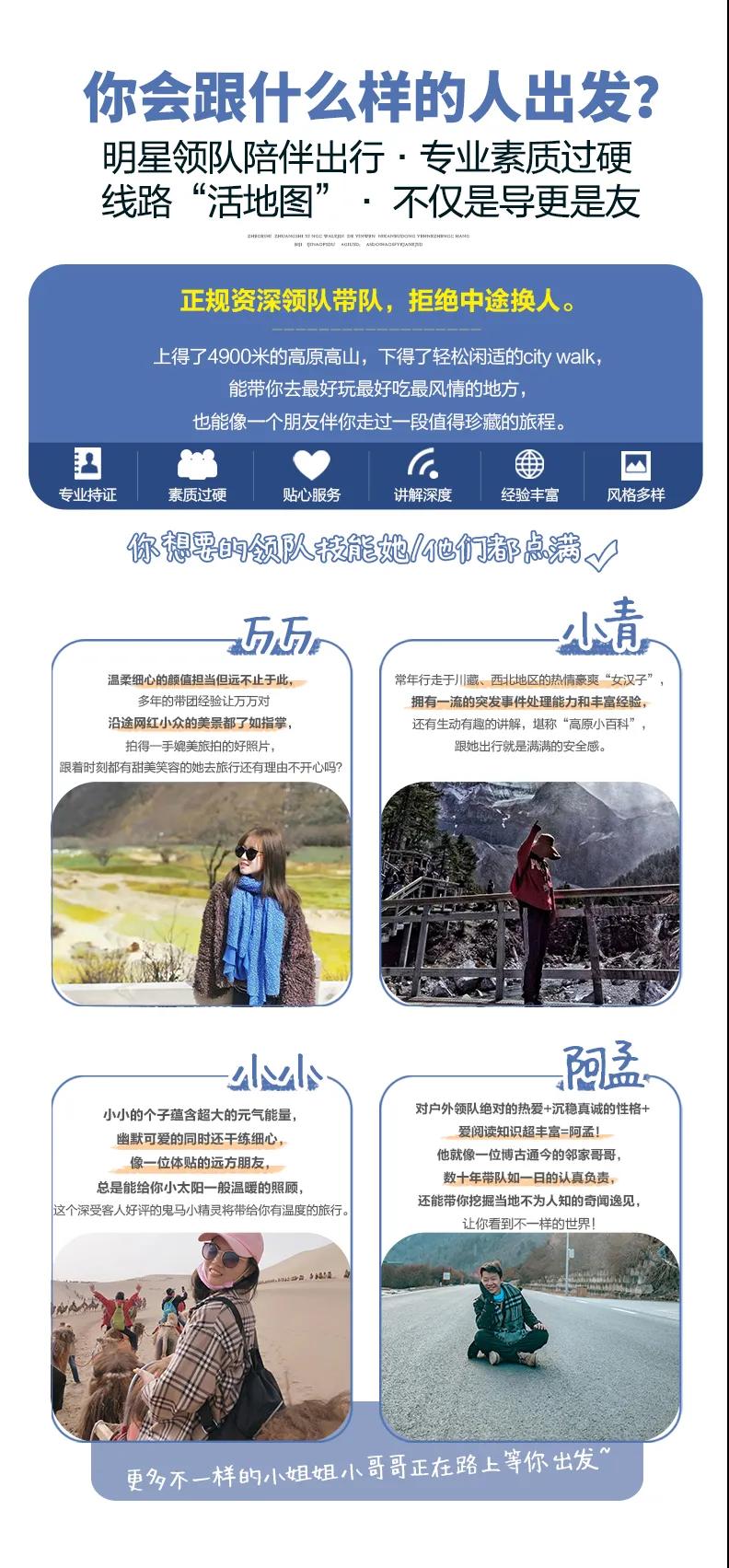 私人訂制:我們客戶范圍囊括了全國(guó)各大城市,川西、西北、東北,皖南,貴州,在路上永遠(yuǎn)有我們的身影。我們將為每一個(gè)有定制需求的你策劃出獨(dú)屬于自己的完美旅行。