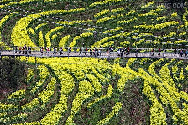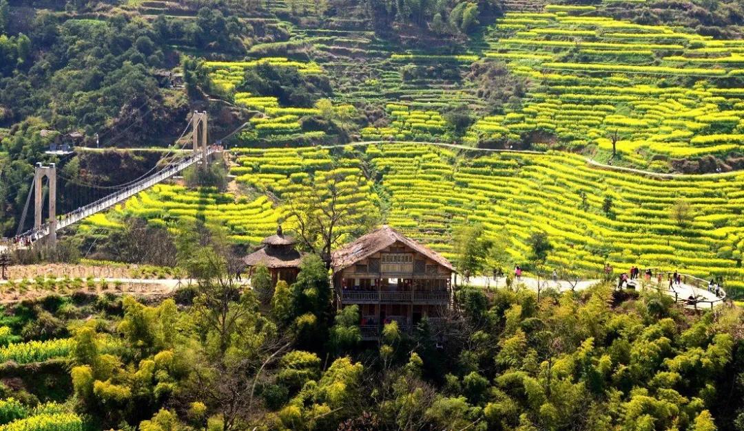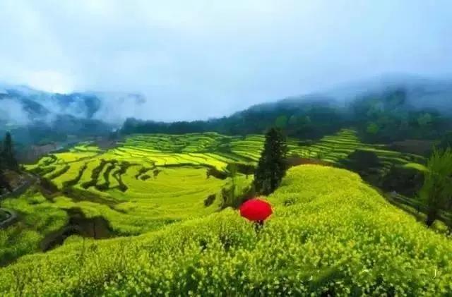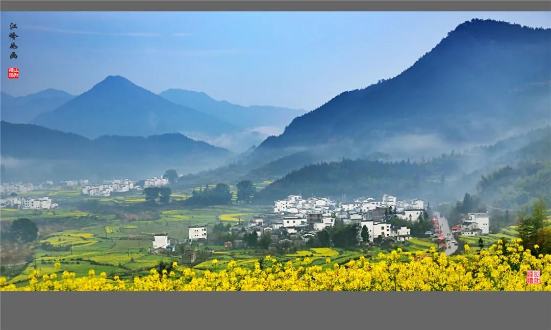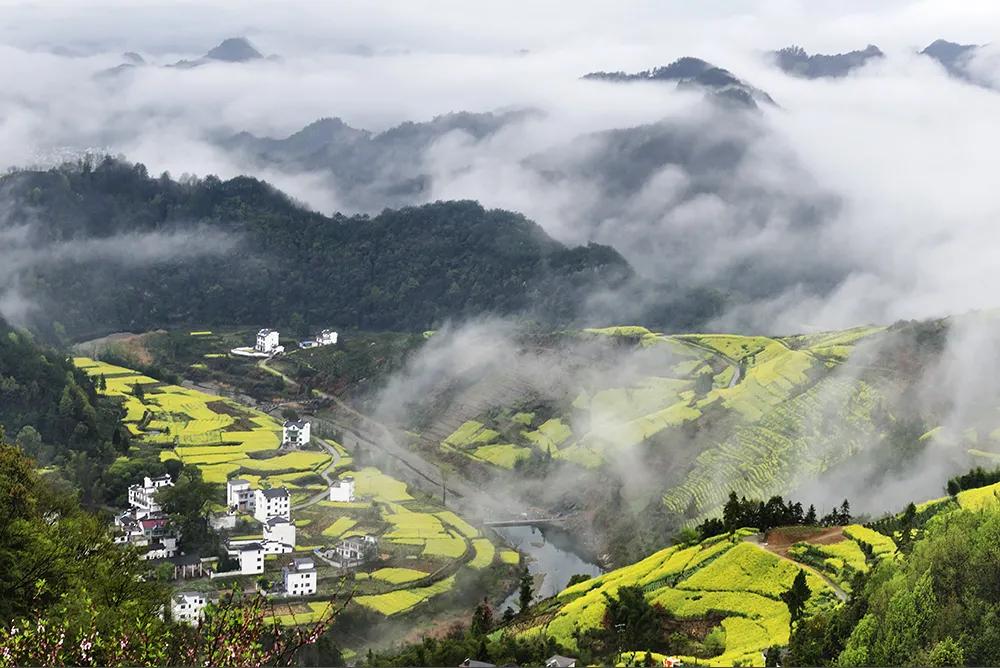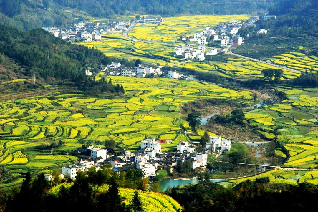 江嶺南臨曉起,東接溪頭,地處婺源縣最東北,是婺源最值得去的地方。站在山頂望去,腳下大片的山谷內(nèi),油菜花層層疊疊,一望無(wú)際,中間圍攏著幾個(gè)小小的村落,黑瓦白墻的徽派民居夾雜在一片金黃之間。