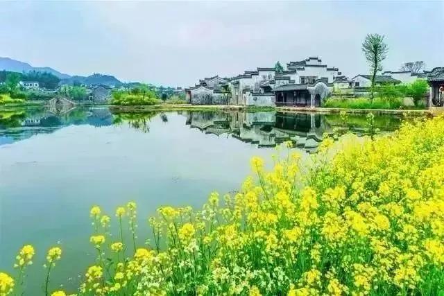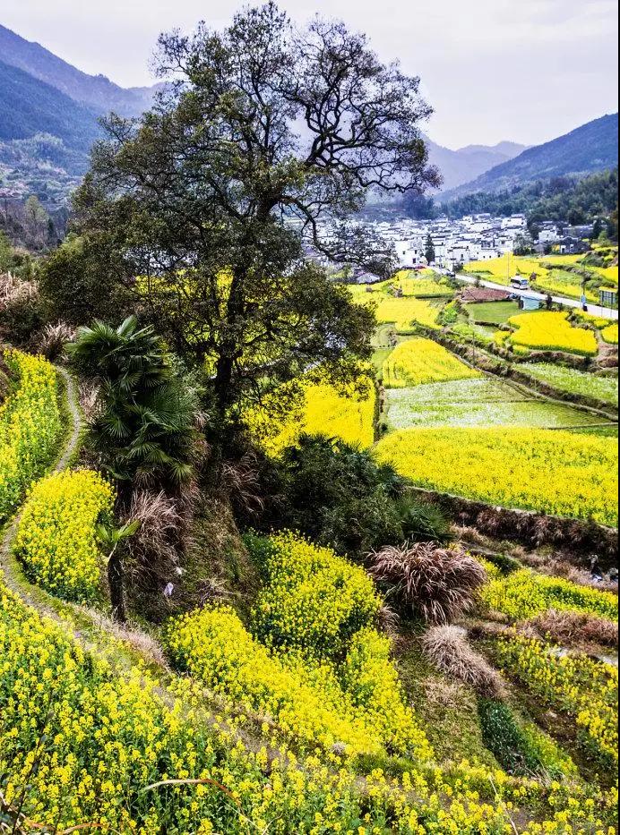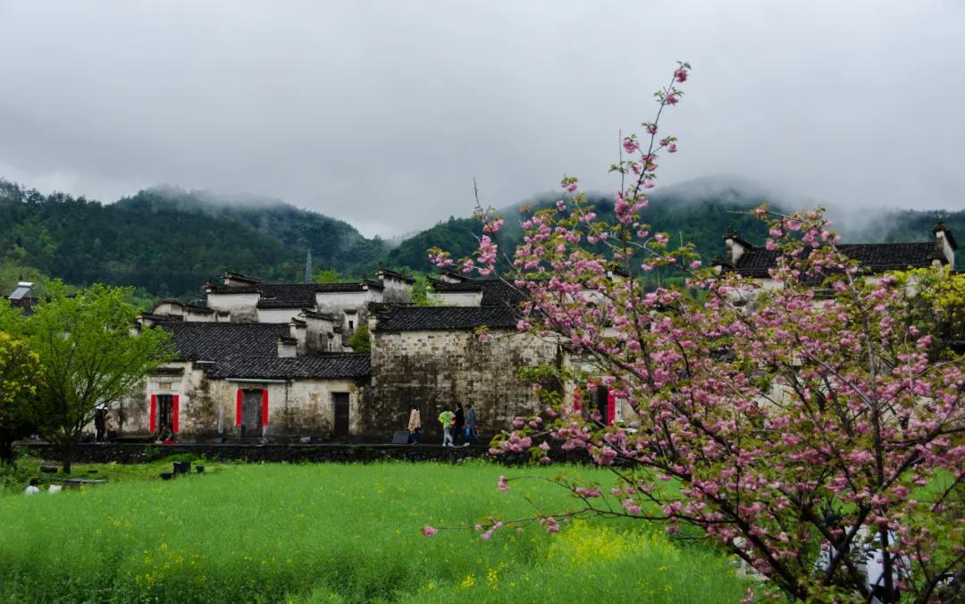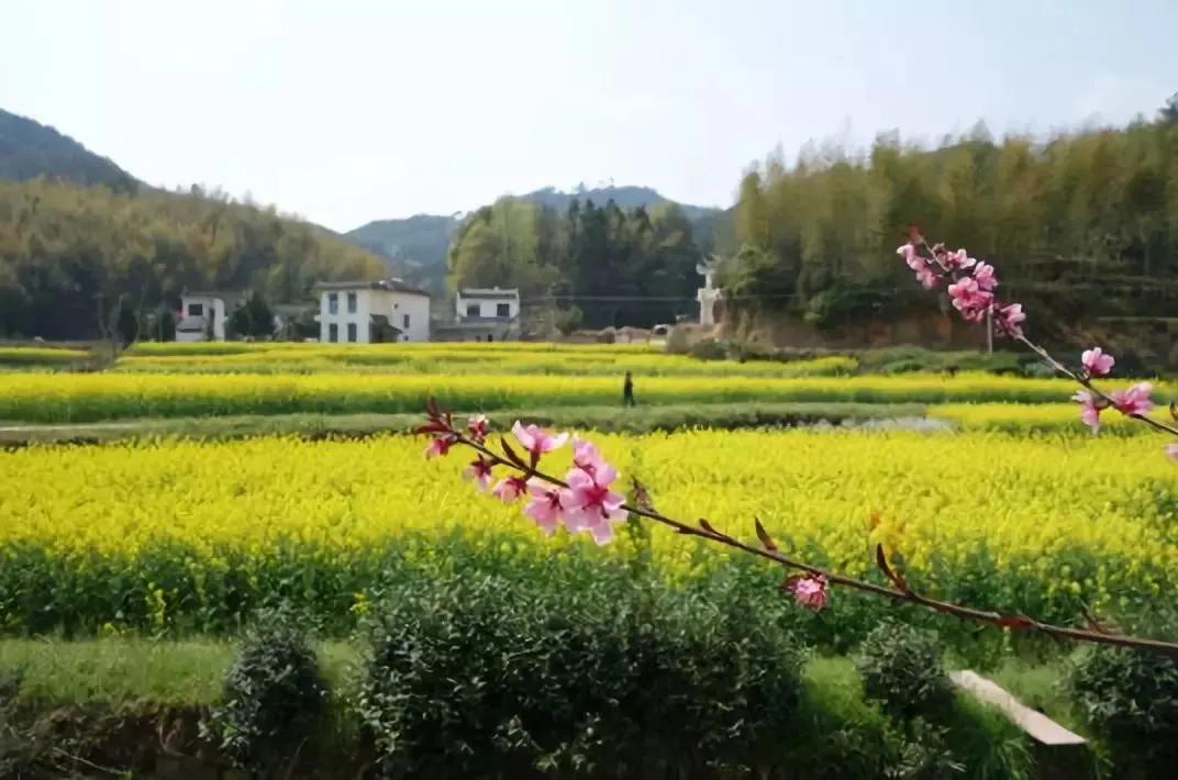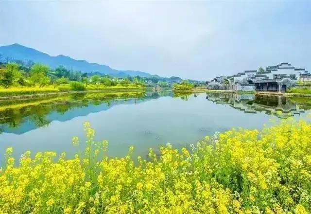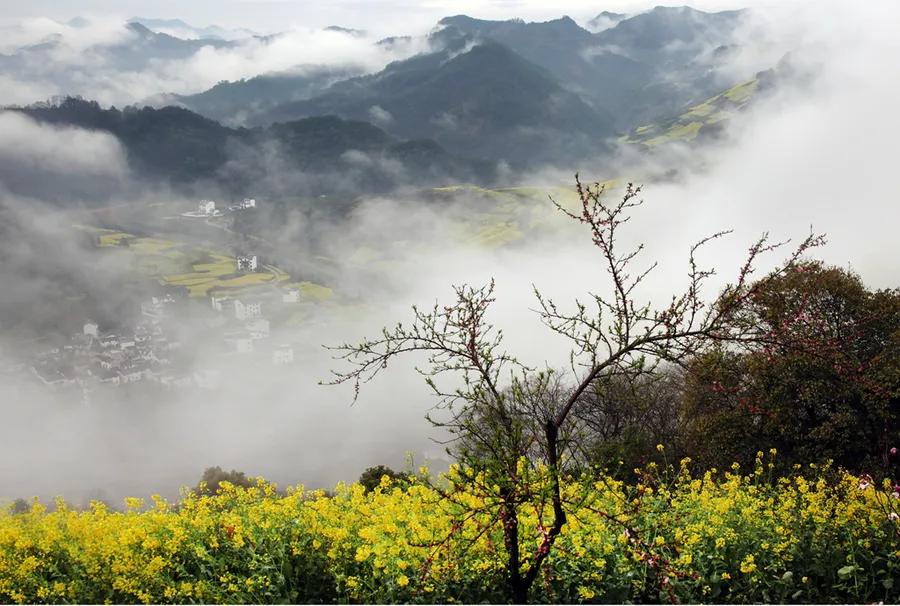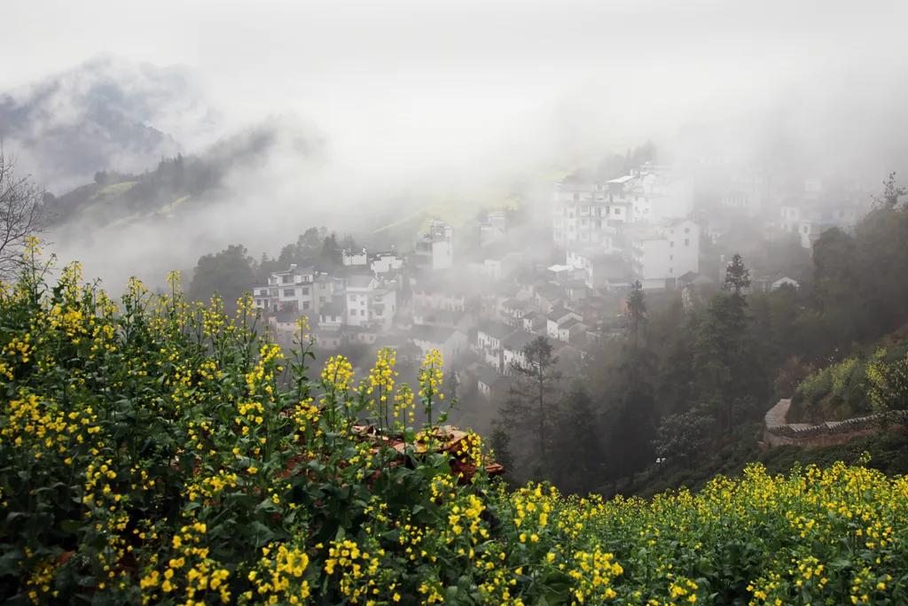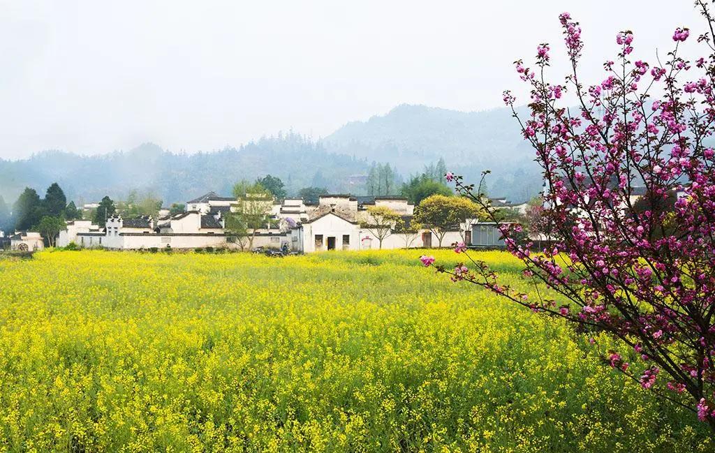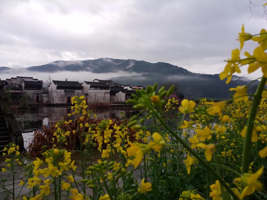 春天來(lái)臨時(shí),漫天金黃的油菜花將水墨色的徽派建筑照耀著,白墻青瓦反射著微黃色的光,細(xì)看之下,還有幾枝桃花點(diǎn)綴其中。村里裊裊炊煙一直飄到了青色的山上,與山上的煙霧糾纏在一起。這大概才是徽州真正的模樣。