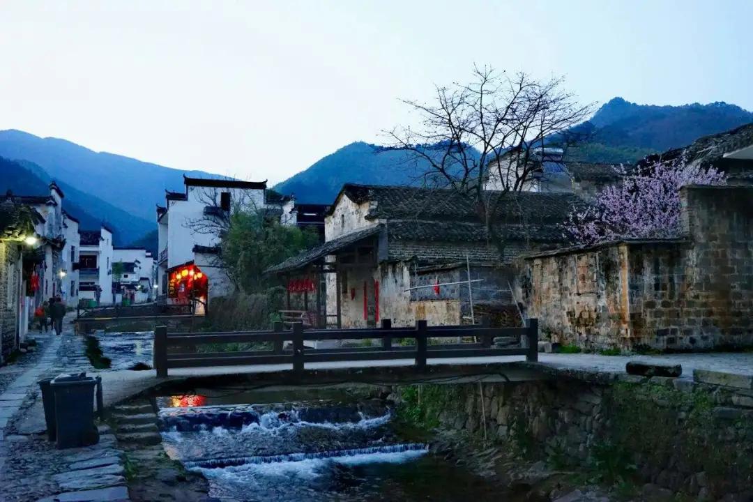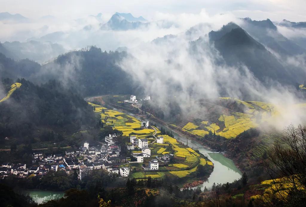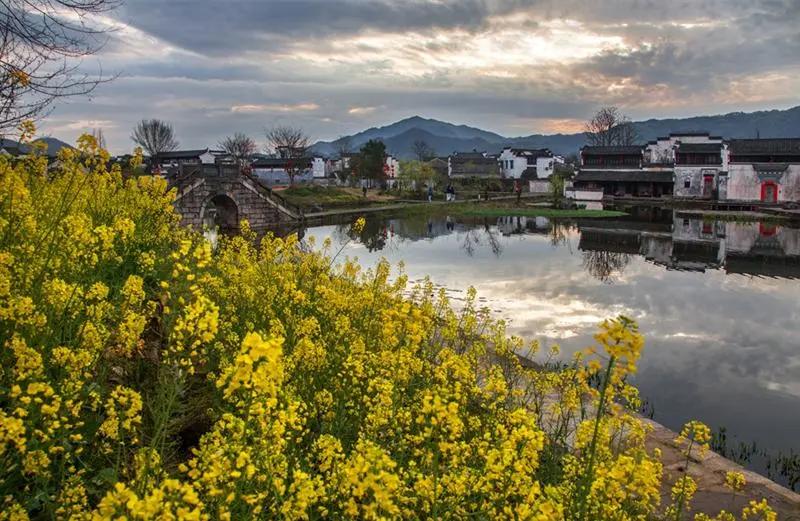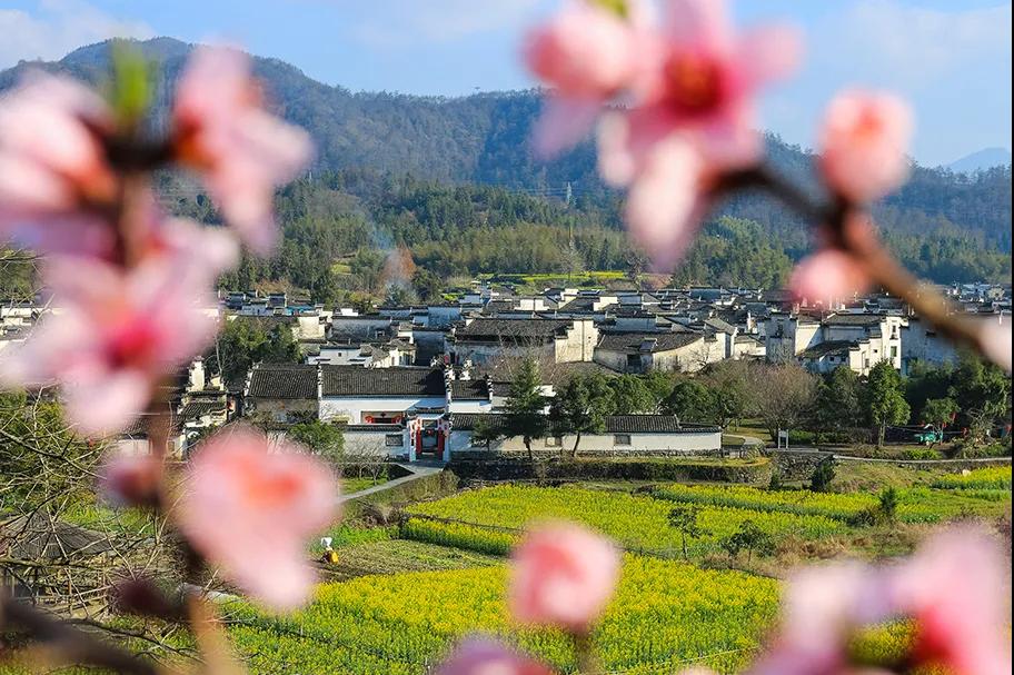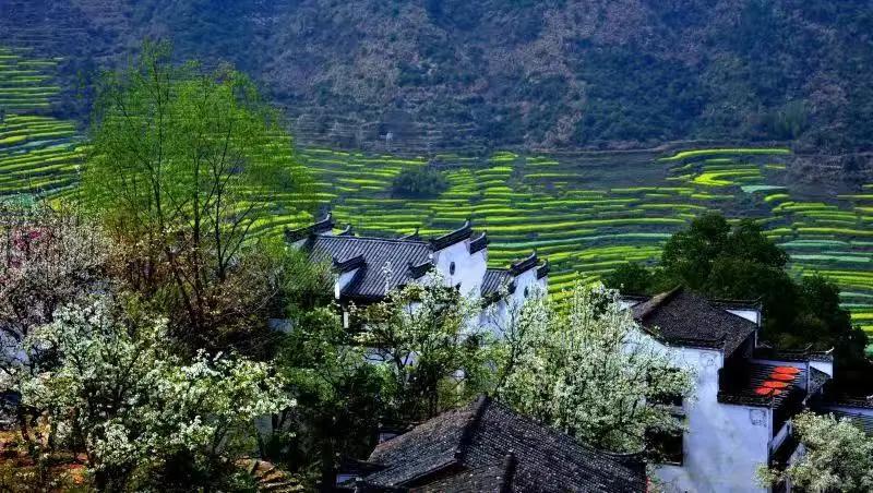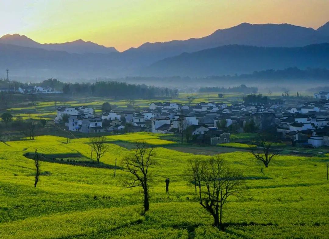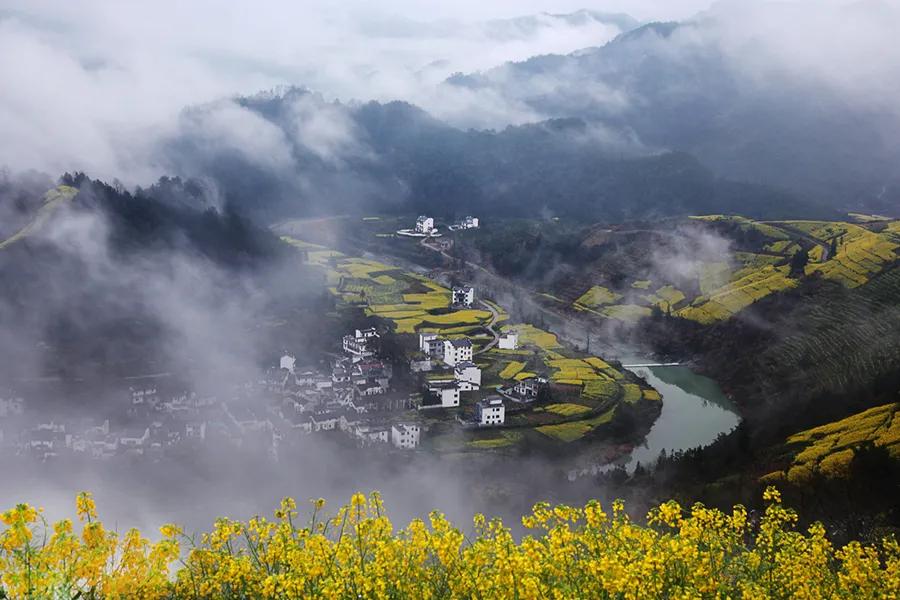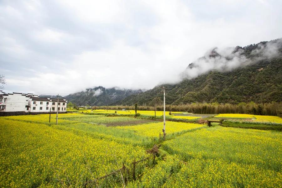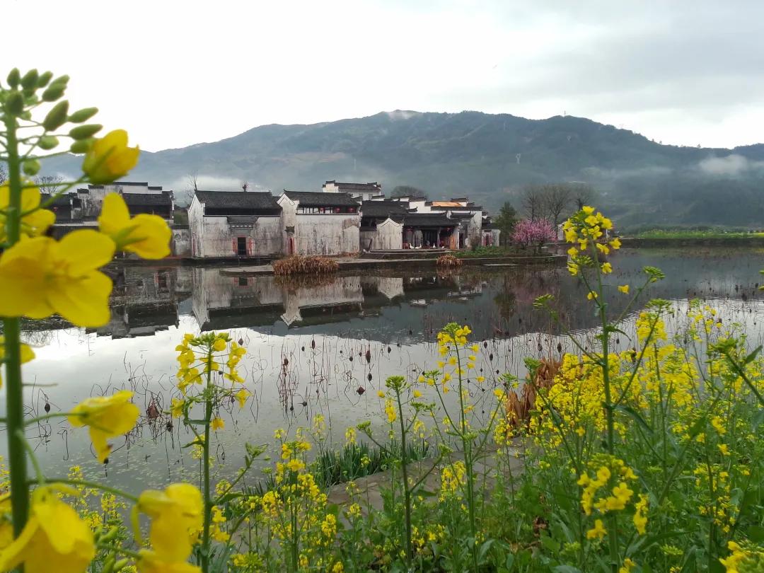 春天來(lái)臨時(shí),漫天金黃的油菜花將水墨色的徽派建筑照耀著,白墻青瓦反射著微黃色的光,細(xì)看之下,還有幾枝桃花點(diǎn)綴其中。村里裊裊炊煙一直飄到了青色的山上,與山上的煙霧糾纏在一起。這大概才是徽州真正的模樣。