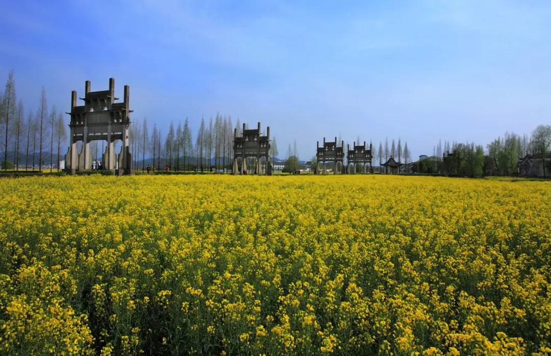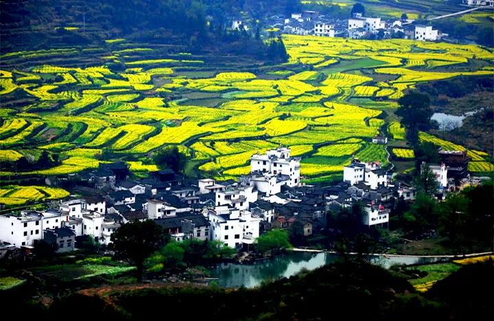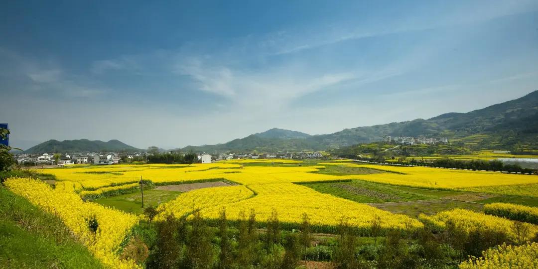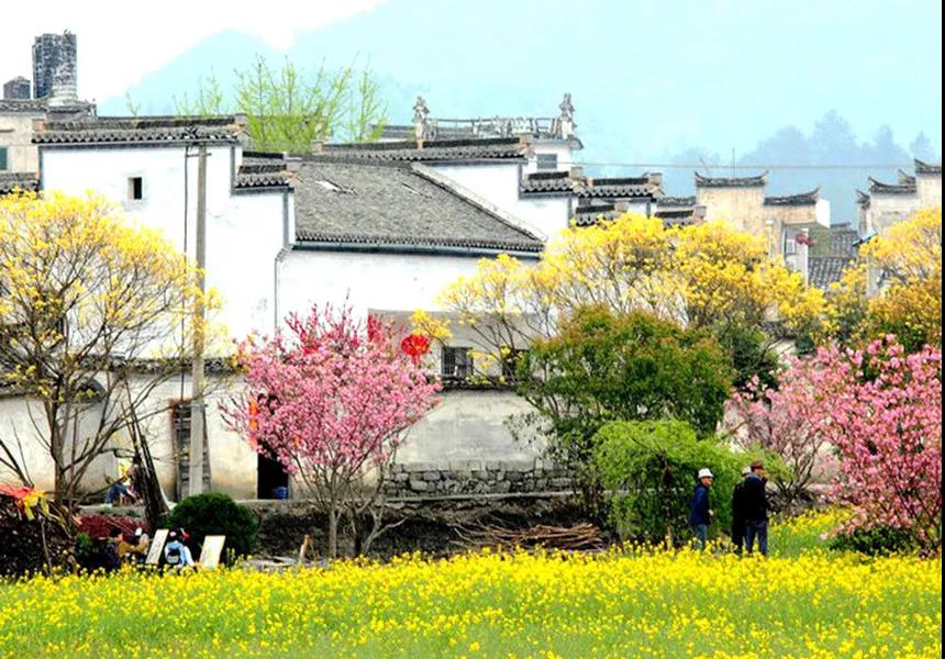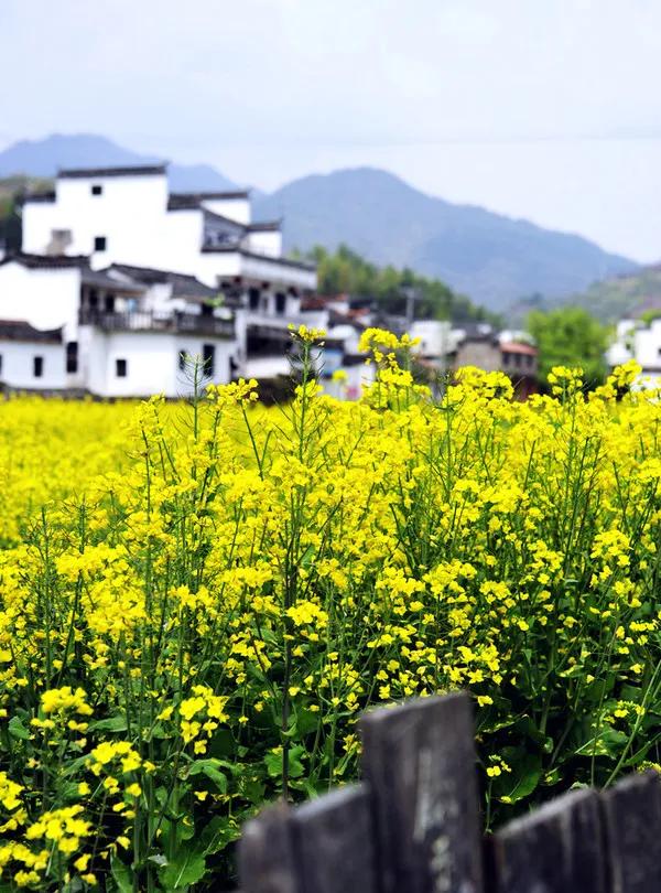 粉墻黛瓦的徽州古民居點(diǎn)綴于廣闊的油菜花叢中