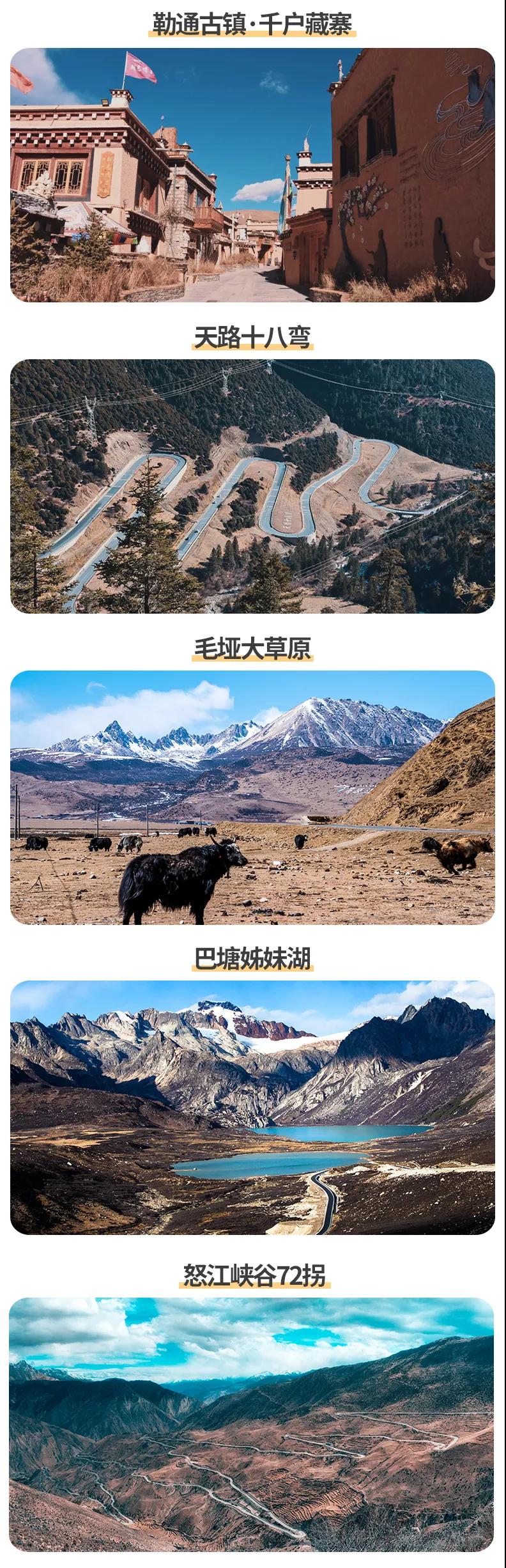 D4 雅江 — (約26公里/40分鐘)天路十八彎 — (約107公里/2小時(shí))理塘長青春科爾寺、勒通古鎮(zhèn)·千戶藏寨— (約74公里/1.5小時(shí))毛埡大草原 — (約95公里/2小時(shí))巴塘 — (約223公里/5小時(shí))姊妹湖 — (約138公里/3小時(shí))芒康