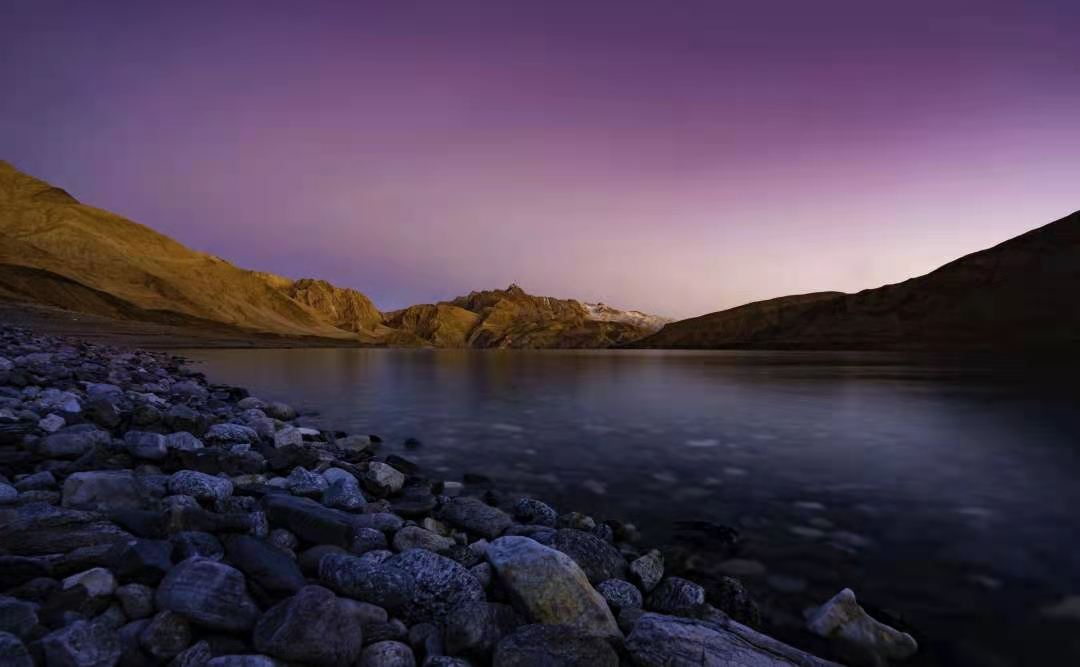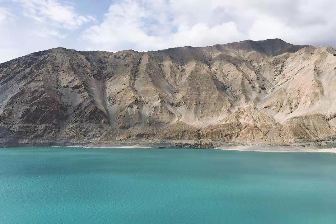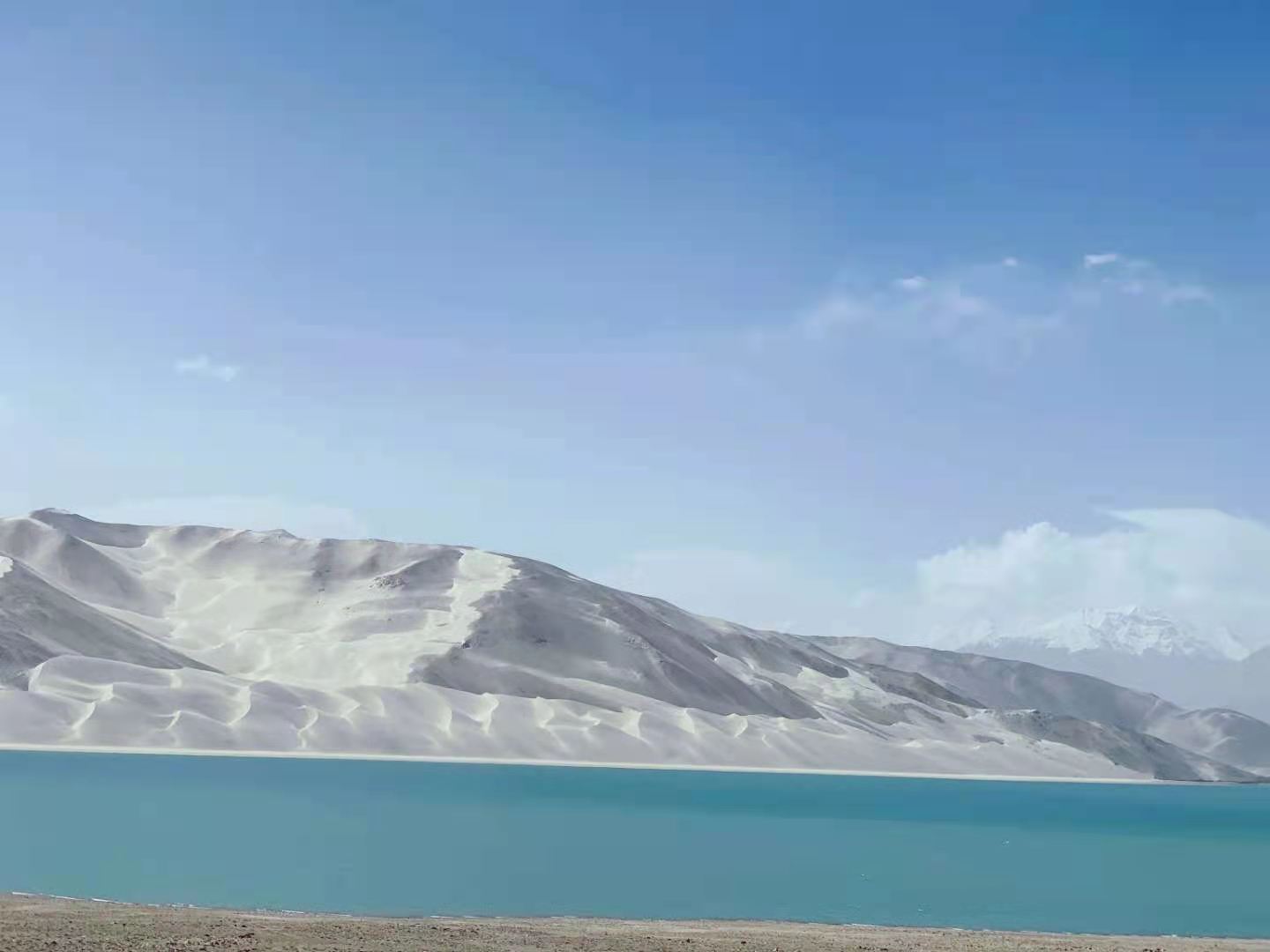 車子行進在海拔三千多米的【蓋孜峽谷】中??龉废褚粭l玉帶,沿著蓋孜河在蓋孜峽谷中穿梭著,眼前的景色又變成了綿延不絕的荒山雪嶺。此時突然出現(xiàn)的美麗湖泊便是【布倫口白沙湖】湖水在帕米爾高原潔靜的陽光下,閃耀著金屬般的光澤。湖水在天空、白沙和雪山的綜合作用下呈現(xiàn)出一種別樣的藍。