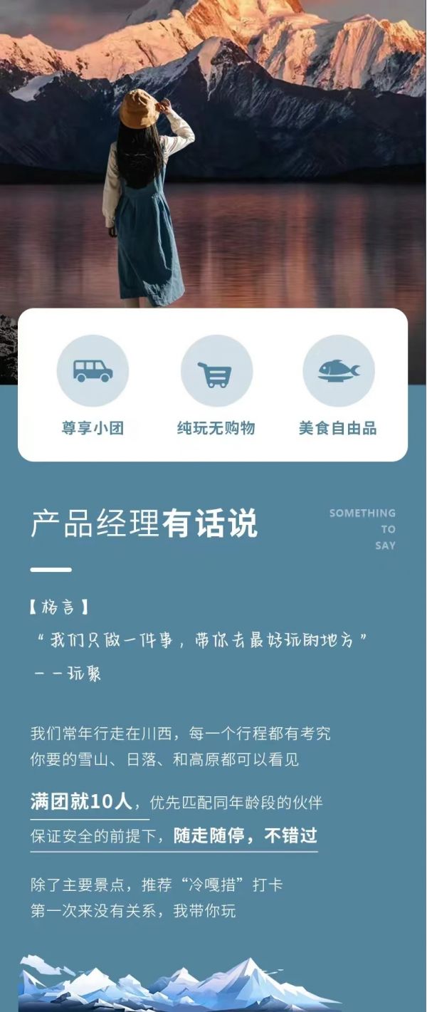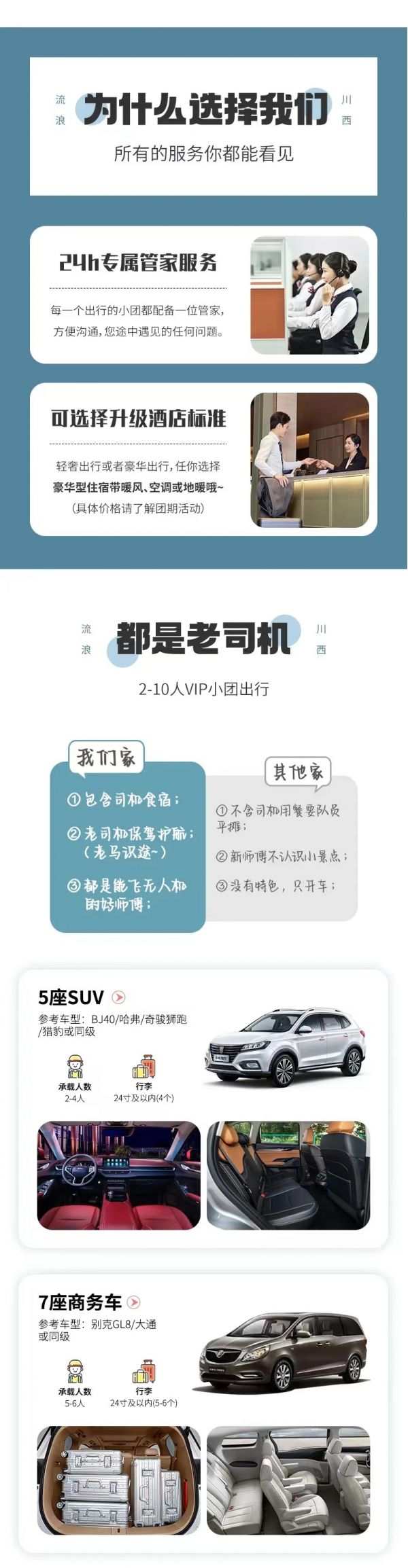 私人訂制:我們業(yè)務(wù)范圍囊括了全國各大城市,川西、西北、新疆、西藏,在路上永遠(yuǎn)有我們的身影。我們將為每一個有定制需求的你策劃出獨(dú)屬于自己的完美旅行。