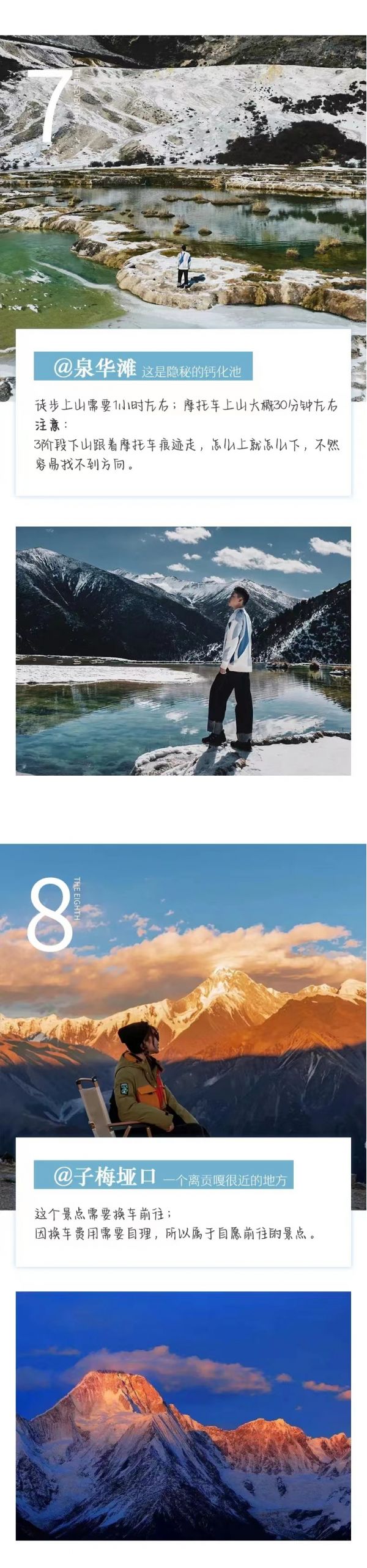 早餐后出發(fā),前往冷嘎措, 徒步時(shí)間步 2-3 小時(shí)(可選擇騎馬單面 200,或者摩托車往返200,費(fèi)用自理),到達(dá)冷嘎措自由拍攝大片( 海拔4500 左右,切記帶上厚外套, 以及帽子圍巾墨鏡,冷噶措風(fēng)大溫度低,以防感冒高反), 觀貢嘎雪山、藍(lán)冰(藍(lán)冰根據(jù)溫度決定)然后下撤返回(冬季若遇大雪下撤時(shí)間根據(jù)實(shí)際情況安排),返回途中可以繼續(xù)前往泉華灘進(jìn)行游玩。晚上入住上木居。