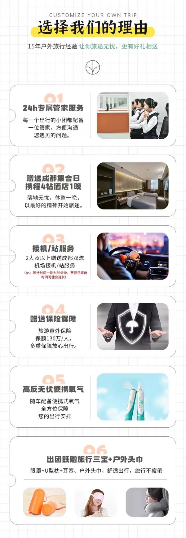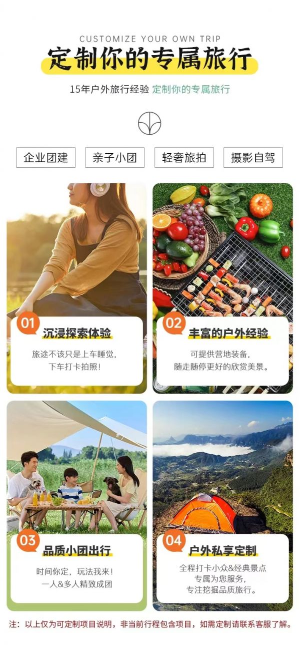 私人訂制:我們業(yè)務(wù)范圍囊括了全國各大城市,川西、西北、新疆,在路上永遠(yuǎn)有我們的身影。我們將為每一個(gè)有定制需求的你策劃出獨(dú)屬于自己的完美旅行。