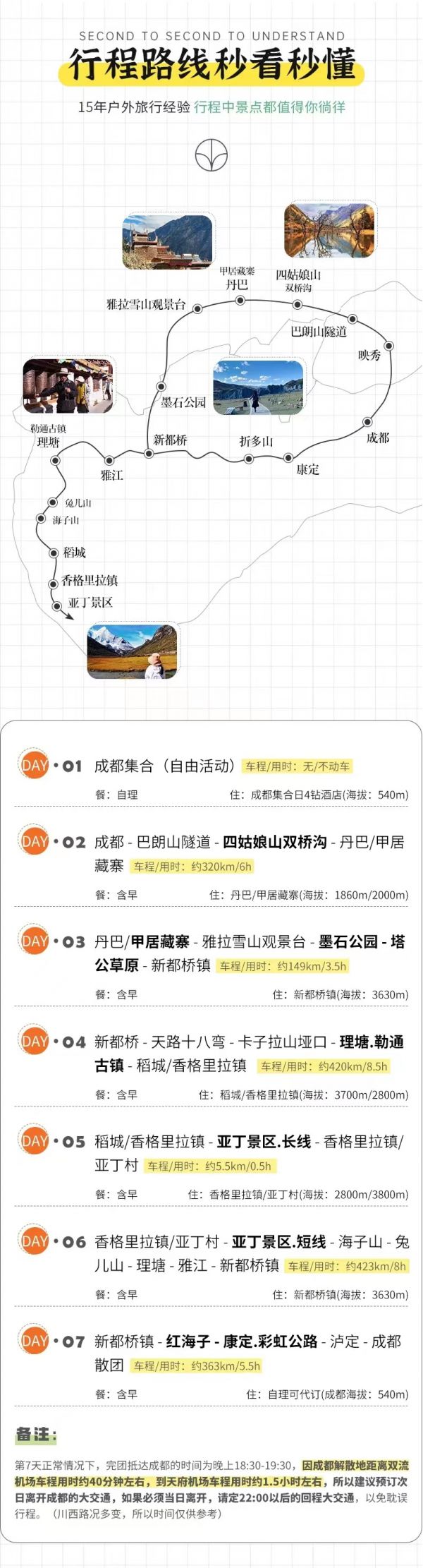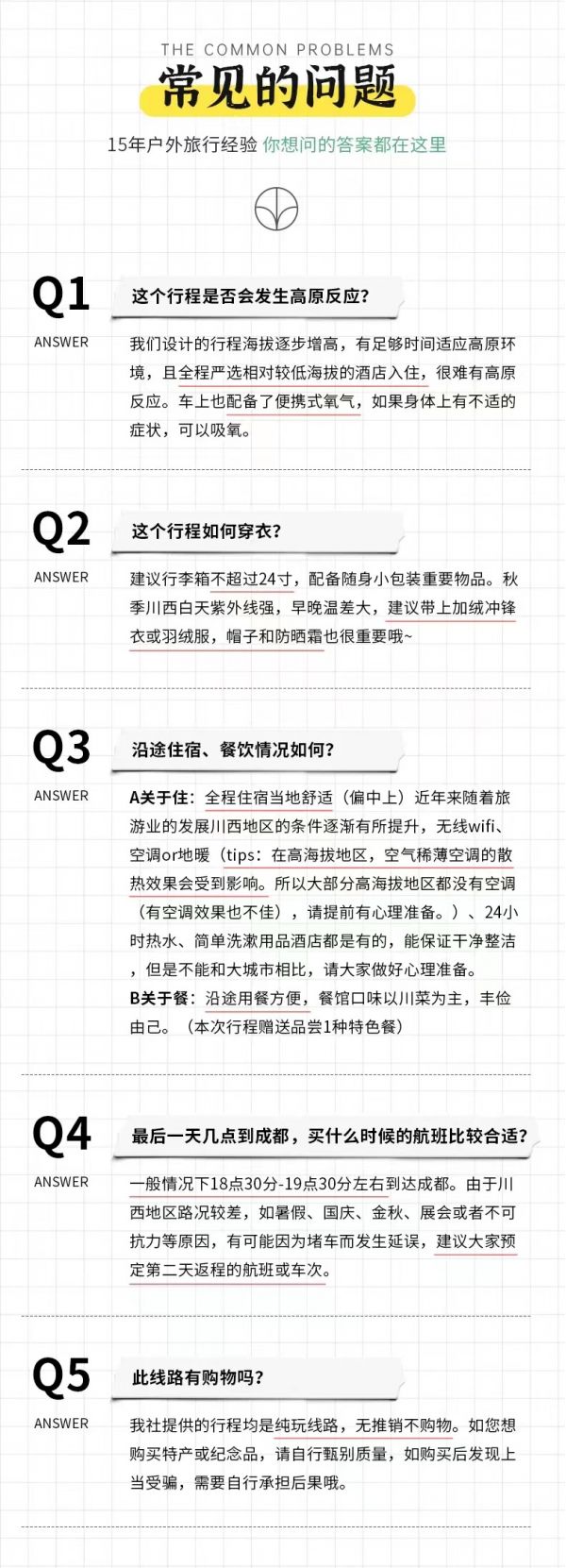 (1)以上行程時(shí)間安排可能會(huì)因天氣、路況等原因做相應(yīng)調(diào)整,正常情況下完團(tuán)回到成都時(shí)間為晚上18:30至19:30左右,如果必須當(dāng)日離開,請(qǐng)定22:00以后的回程大交通,以免耽誤行程,敬請(qǐng)諒解;