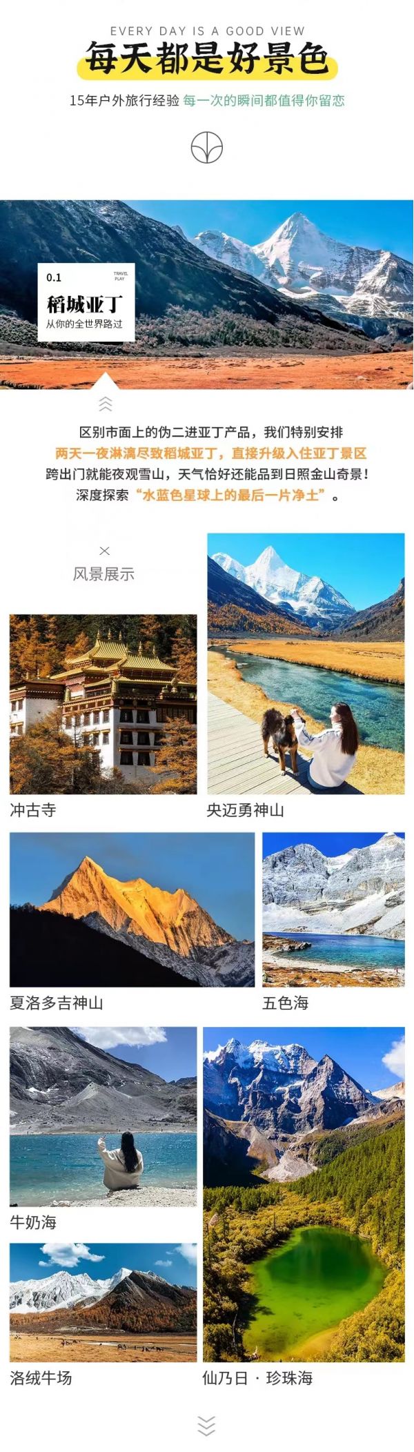 住宿:香格里拉鎮(zhèn)或亞丁村酒店標(biāo)間說明”今天我們前往亞丁門票站換乘景區(qū)觀光車進(jìn)入【稻城亞丁風(fēng)景區(qū)】,大概50分鐘后到亞丁村。在亞丁村用好午餐后,帶上簡單的行裝,抵達(dá)【扎罐崩】后徒步長線(往返10公里),徒步500米乘坐電瓶車(自理往返80元/人、單程50元/人,建議乘坐電瓶車節(jié)省體力)前往【洛絨牛場】(如徒步需單程1 — 2小時(shí)左右達(dá)到洛絨牛場)。這里是觀【夏諾多吉神山】(意為金剛手菩薩,海拔5958米)【央邁勇神山】(意為金文殊菩薩,海拔5958米)的最佳地點(diǎn),是稻城亞丁核心景區(qū)最具代表性的景點(diǎn),一望無垠的草甸,一條如飄帶般柔美的河流在上面隨意的奔騰著,神山圣水與心共鳴,盡情沉醉在這夢(mèng)幻之地吧。