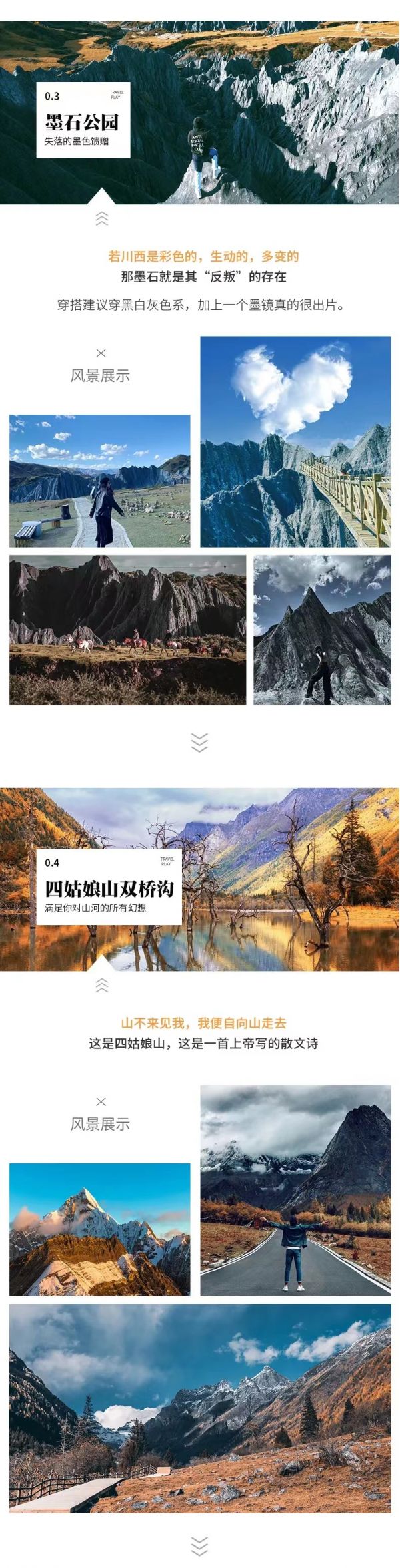 住宿:丹巴縣酒店或甲居藏寨民宿標(biāo)間說明”早餐后酒店集合出發(fā),沿岷江而上,沿途經(jīng)都江堰、紫坪埔水利工程,沿都汶高速抵映秀,沿途感受2008年汶川大地震“地動(dòng)山搖、山崩地裂、滄海桑田”后的景象,感悟大自然的力量;觀看震后統(tǒng)一重建的具有民族特色的民居,感受人定勝天的威力。而后從映秀出抵耿達(dá)鄉(xiāng)沿臥龍峽谷,欣賞峽谷小橋、流水、枯藤、老樹的美麗風(fēng)光,而后經(jīng)巴郎山可觀映山紅、紅白杜鵑花、松蘿、高山草甸等;觀看植物從常綠闊葉林到高山荒漠的垂直變化,感受“一山觀四季、十里不同天”的氣象變遷。中午抵達(dá)四姑娘山。午餐后游玩雙橋溝,景區(qū)開闊平坦、景點(diǎn)集中,全程通車。雖已開發(fā),但環(huán)境維護(hù)的出于意料的好,景區(qū)內(nèi)各種服務(wù)包括指示也十分清晰明了,游客們可以更加舒適、方便的游覽整個(gè)景區(qū)。由于整條溝海拔落差達(dá)到一千多米,所以地貌比較豐富,風(fēng)景也完全值得期待。給人遠(yuǎn)離塵世的感悟。游玩盡興后出溝前往丹巴或小金入住酒店休息。