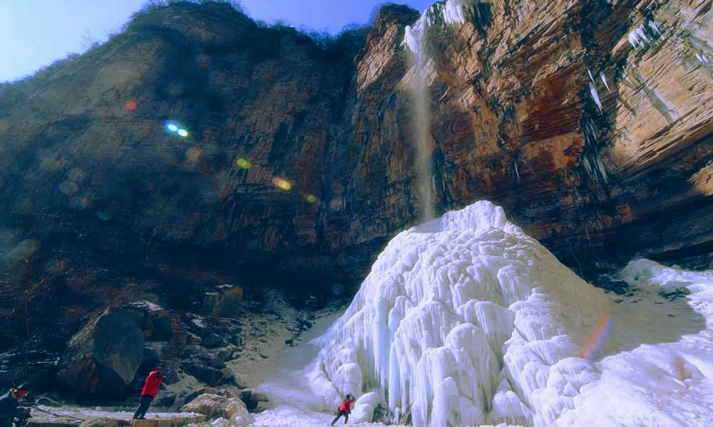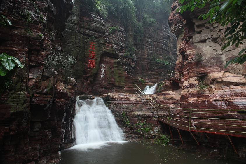 五連瀑水從西南峽谷中流出,形成五級(jí)連環(huán)瀑布。五連瀑的瀑布下有洞,人稱遇仙洞。傳說(shuō)東漢永平年間劉晨和阮肇就是從這里被仙女接引到洞中的。