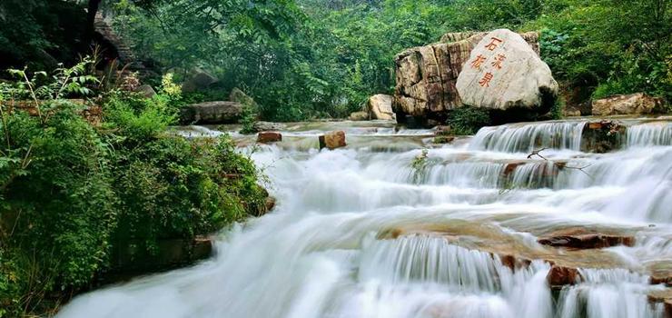 石板流泉水清如境,一百余米的清泉,從石板上流過(guò),兩旁懸崖對(duì)出,樹(shù)木蒼郁,太陽(yáng)從樹(shù)蔭間照射石上,水波粼粼,閃光耀彩,在這里人們可做、可臥、可吟、可殤,大有王維“明月松間照,清泉石上流”的意境。