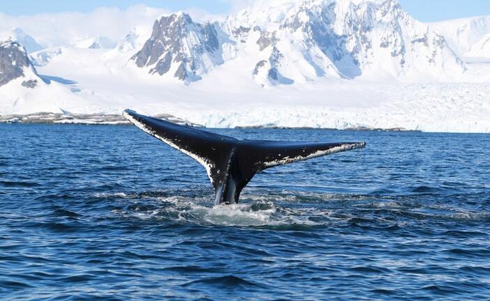 在南極的潘諾拉航道上,彼得曼島是最精彩的風(fēng)景,因?yàn)榭梢钥吹胶V型跽撸L魚。彼得曼島附近總有鯨魚出沒,它們巨大的身姿隱藏在這片深邃極冷的海中。