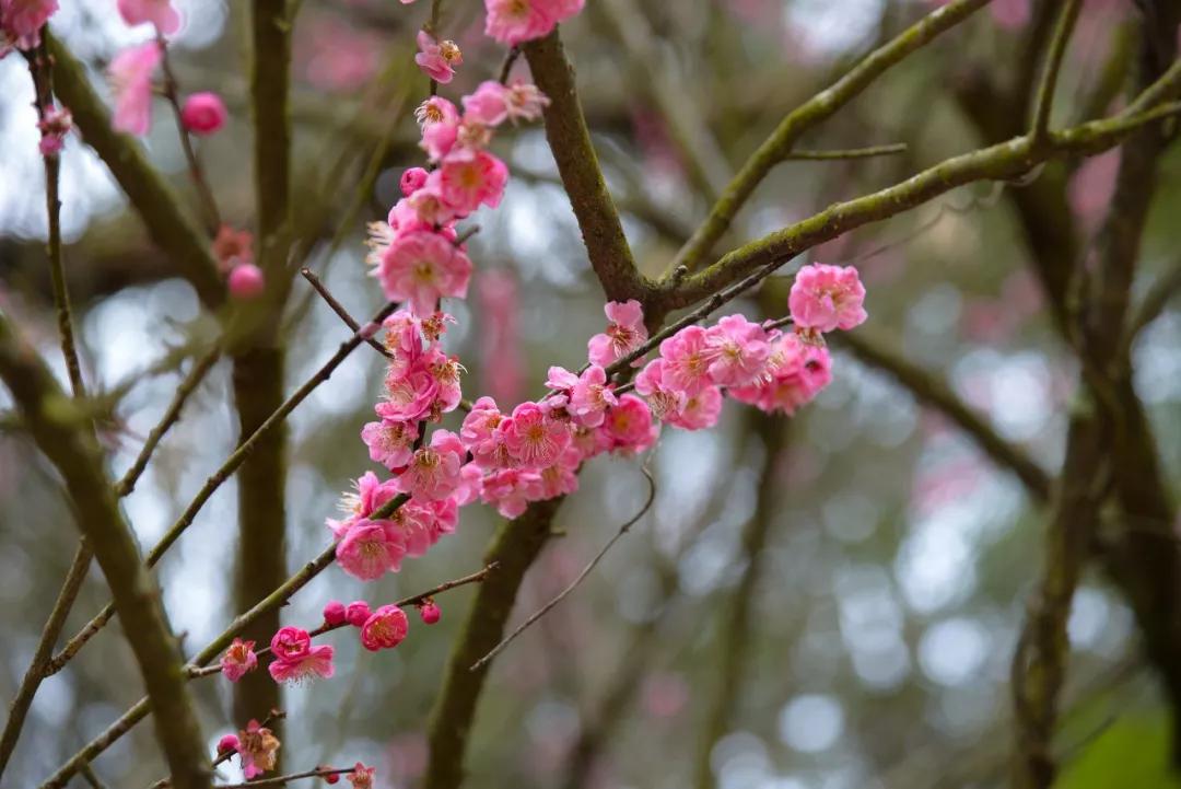 在這油菜花即將盛開的時節(jié),篁嶺的梅花、山茶花早先一步開放,天街道路兩旁,已是粉紅一片。