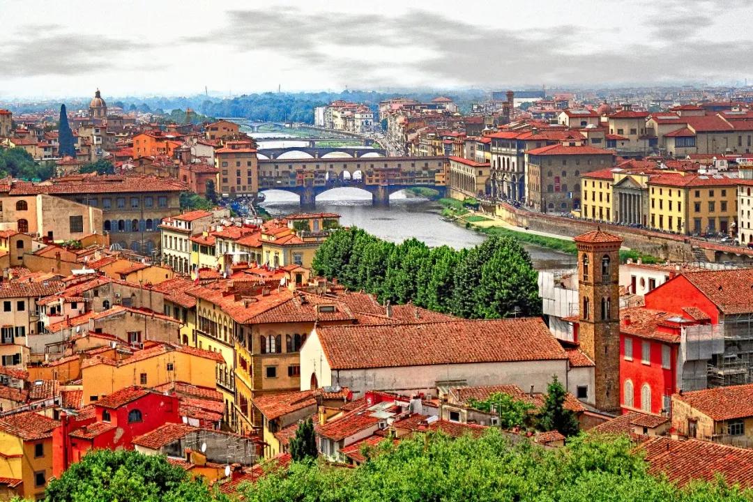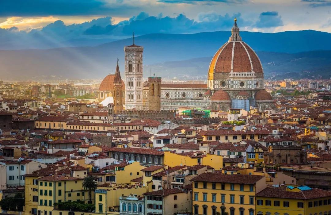 文藝復(fù)興的城市佛羅倫薩,橘紅色圓頂?shù)氖ツ赴倩ù蠼烫檬欠鹆_倫薩最重要的地標(biāo),由教堂、洗禮堂、鐘樓組成,洗禮堂的正門(mén)由于大師米開(kāi)朗基羅的贊譽(yù)而得到“天堂之門(mén)”的美譽(yù)。