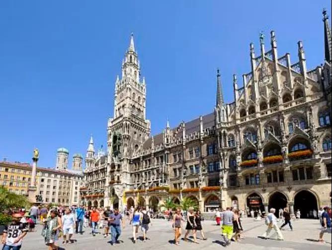 慕尼黑市中心的瑪麗恩廣場(chǎng),裝飾富麗堂皇的新市政廳位于瑪麗亞廣場(chǎng)北側(cè),19世紀(jì)末建造的巍峨挺拔的棕黑色建筑,上面像撒了一層白霜。