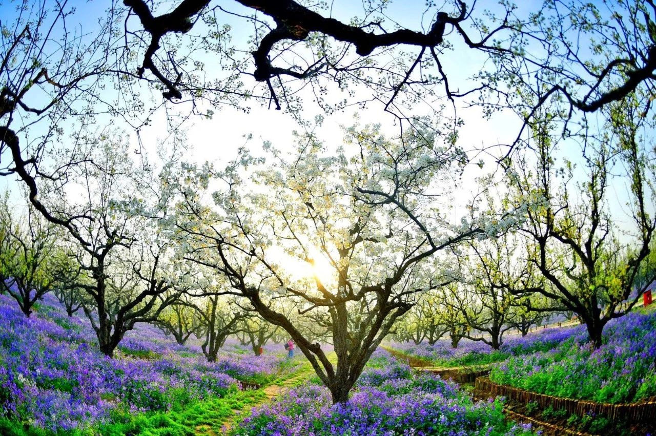 4、春季梨花盛開的季節(jié),這里是一片冰清玉潔的世界,白色的梨花紫色的二月蘭,一望無際的白紫交融的——梨蘭會(huì);