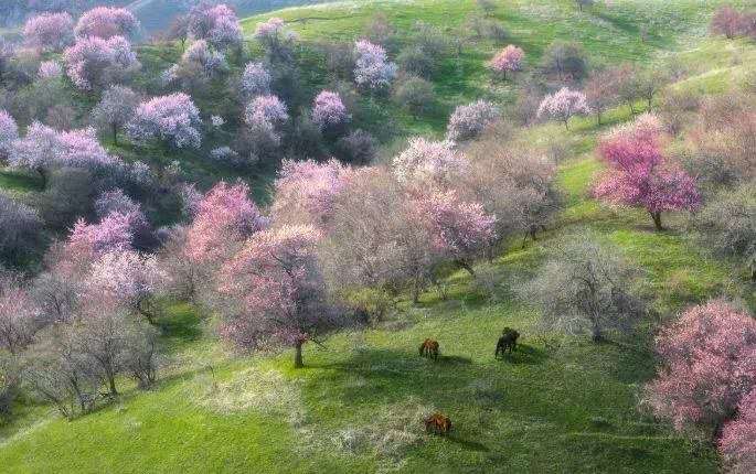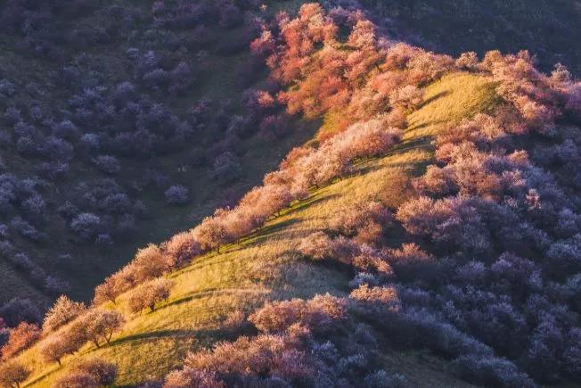 4月初,這里就變身杏花海洋,每個(gè)山巒都點(diǎn)綴著開滿了花朵的野樹林。